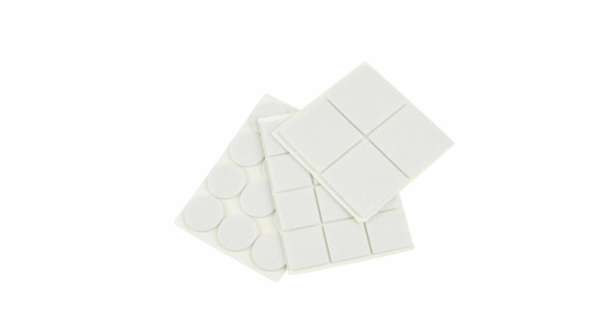 Self-adhesive felt protector set, round and rectangular, 25 x 25 mm / 40 x 40 mm, white, Geko G29815 description of