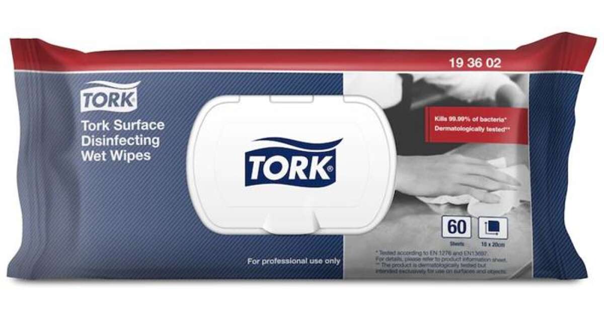 Practical, resealable pack of Tork surface disinfecting wet wipes, 60 wipes per pack. Ideal for both home and office use.