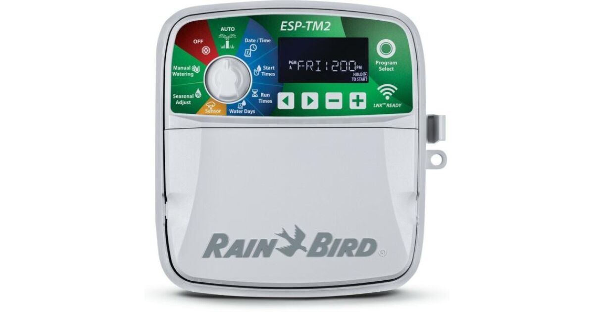 Simple, flexible and reliable. The ESP-TM2 irrigation controller is the perfect solution for basic irrigation tasks. With the flexibility of 3 programs and 4 start times per program, you can customize your irrigation schedule to suit your garden's needs. The ESP-TM2 controller features an extremely simple programming interface. To turn the ESP-TM2 into a WiFi compatible controller, simply insert the LNK WiFi module. Features Quick installation Fixed 6-zone controller Suitable for indoor or outdoor installation Easy to program Quick programming in just 3 steps 3 available programs (A, B, C) with up to 4 start times for each program Easy one-button manual watering NEW, large backlit LCD display for improved visibility in low light and direct sunlight WiFi connectivity By simply connecting the Rain Bird LNK WiFi module (sold separately), users can access, operate and monitor their irrigation system from anywhere. Internet-based weather information is used to make daily adjustments to the irrigation schedule, saving up to 30% of water. For support and assistance with LNK WiFi and the Rain Bird Mobile App, please visit http://wifi-pro.rainbird.com/support/ Advanced Features Contractor Default™ allows you to easily save and reset your custom schedule Delay irrigation for 14 days and automatically resume irrigation after the set delay expires Any station bypass rain sensor allows you to customize which stations respond to the rain sensor Set the Constant Days Off program to ensure irrigation never occurs on those days, when maintenance personnel are on site (for odd/even/cyclical schedules) Seasonal setting by program allows you to easily decrease or increase irrigation by program Specifications Controller features Familiar, easy-to-navigate user interface Rain sensor input, Off Master valve/pump start output Non-forgetful (100-year) storage memory Electronic diagnostic circuit breaker Remote accessory port for Rain Bird approved accessory devices Scheduling features Program-based scheduling with 3 individual programs and 4 independent start times per program for 12 total start times Irrigation scheduling options: Individual week days, ODD or EVEN calendar days or Cyclic (1-30. Advanced Features Compatible with Rain Bird LNK WiFi module (sold separately) to allow remote programming, operation and alarms from the Rain Bird mobile app. Manual watering option for all stations, single station or individual program Seasonal setting for all programs or individual program Delayed watering for up to 14 days Permanent days off (for odd, even or cyclic programming) Sensor bypass for all programs or individual stations Adjustable delay between stations Main valve on/off per station Automatic short detection with station-specific alarm messages Operational specifications Station timing: 1 minute - 6 hours Seasonal setting: from 5% to 200%