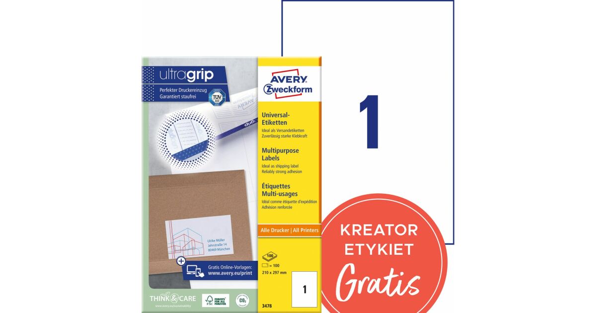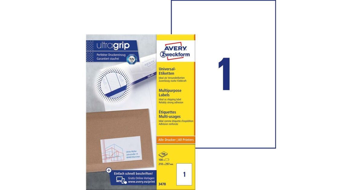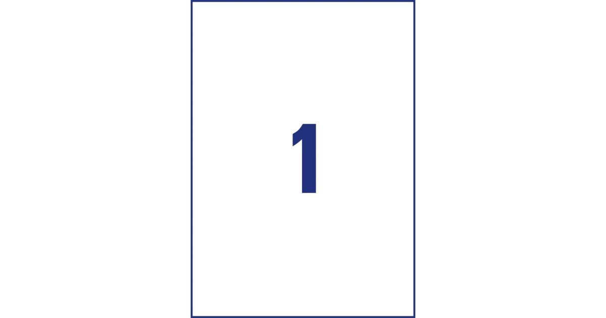 Label sticker, 210 x 297mm, universal, 1 label/sheet, 100 sheets/box, Avery white