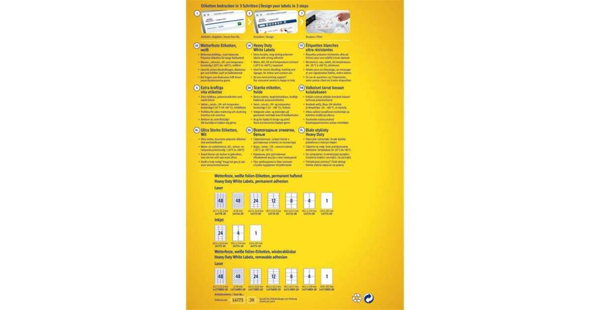 - 20 A4-sized, white, weatherproof polyester labels (1 label/sheet)