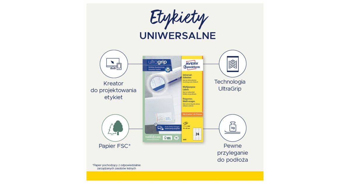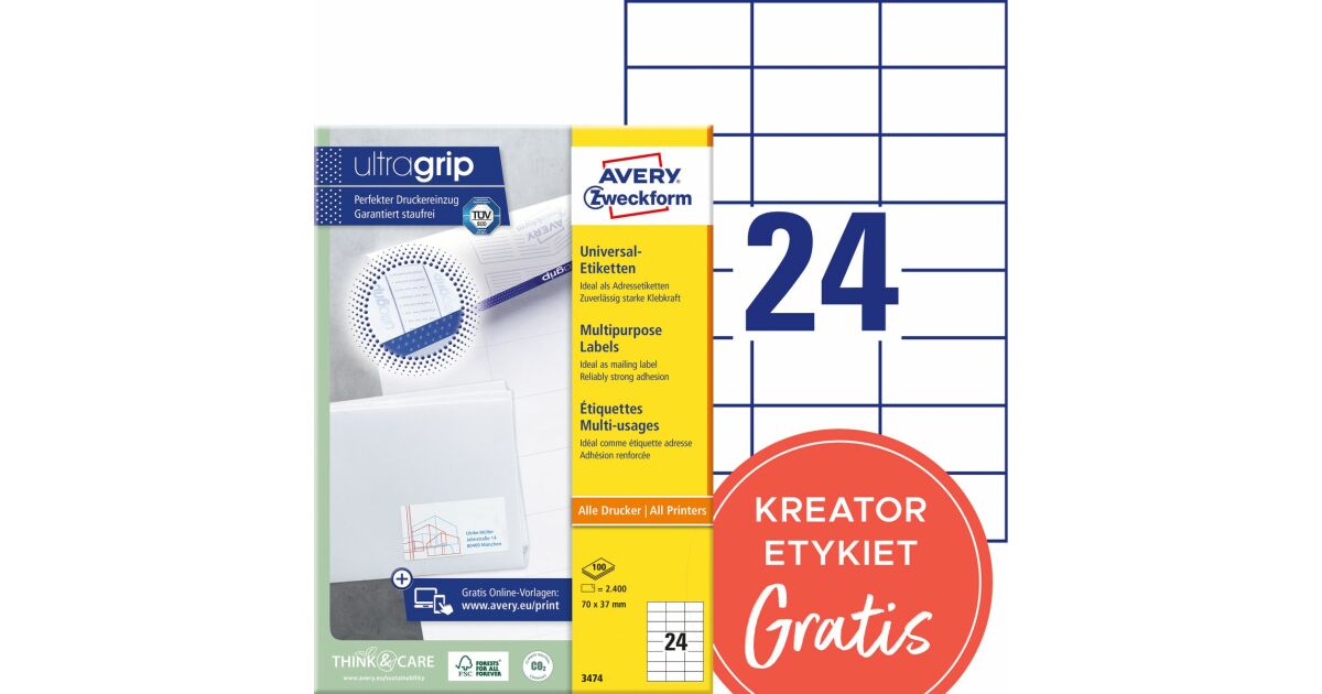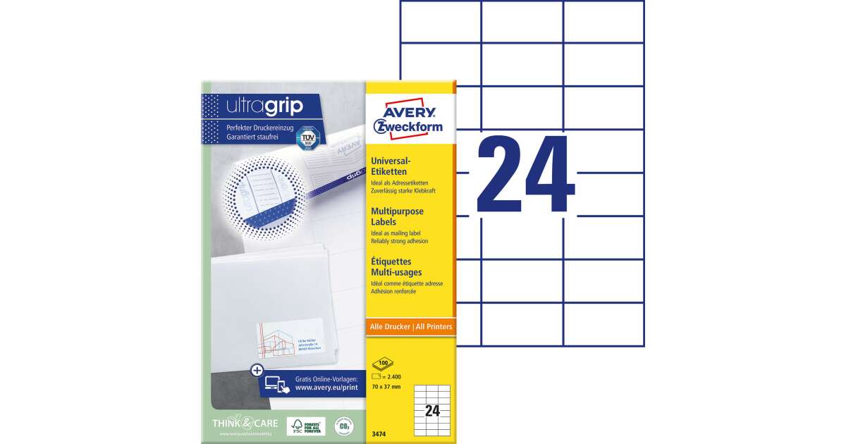 Avery white Labels, 70 x 37mm, universal, 24 labels/sheet, 100 sheets/box description of