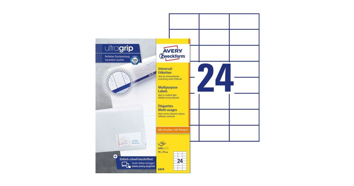 These Avery Zweckform 3474 universal labels are ideal for all kinds of labeling tasks. The 70x37 mm labels come in sheets of 24, with 100 sheets per box.