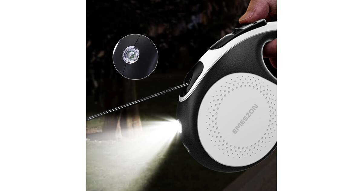 Emeszon® Retractable Electric Dog Leash with LED Flashlight 200 Lumen, for dogs up to 50 kg, with rechargeable battery, tangle-free system and 5 meter strong and reflective strap description of