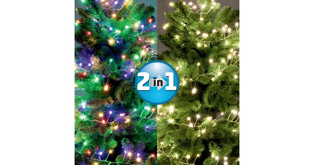 This 2-in-1 string light is perfect for festive decorations or creating a cozy atmosphere in your garden. The 600 LED light string is 12 meters long (3m cable + 9m lights) and features two lighting modes: warm white and colorful.