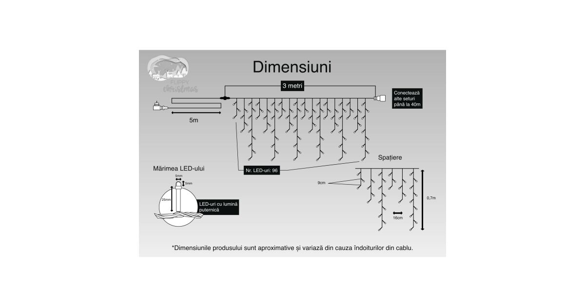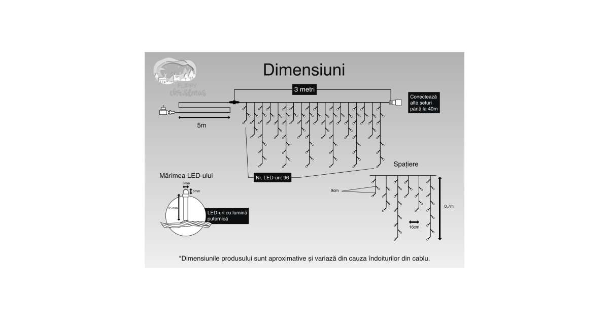 Turturi Christmas Light Curtain, IP44, 3 m, 96 LEDs, Fringed Curtain, Warm White, 8 Lighting Modes, Transformer 31 V, Power 9 W, Connectable, Indoor/Outdoor, 5 m Extension Cord, Black Cable description of