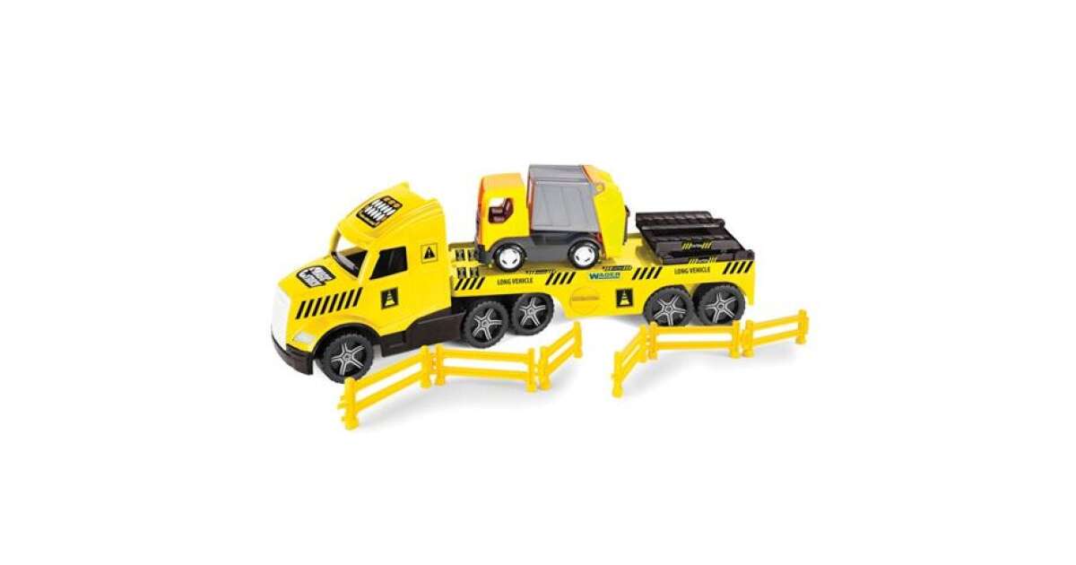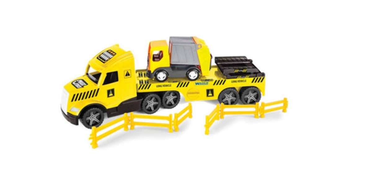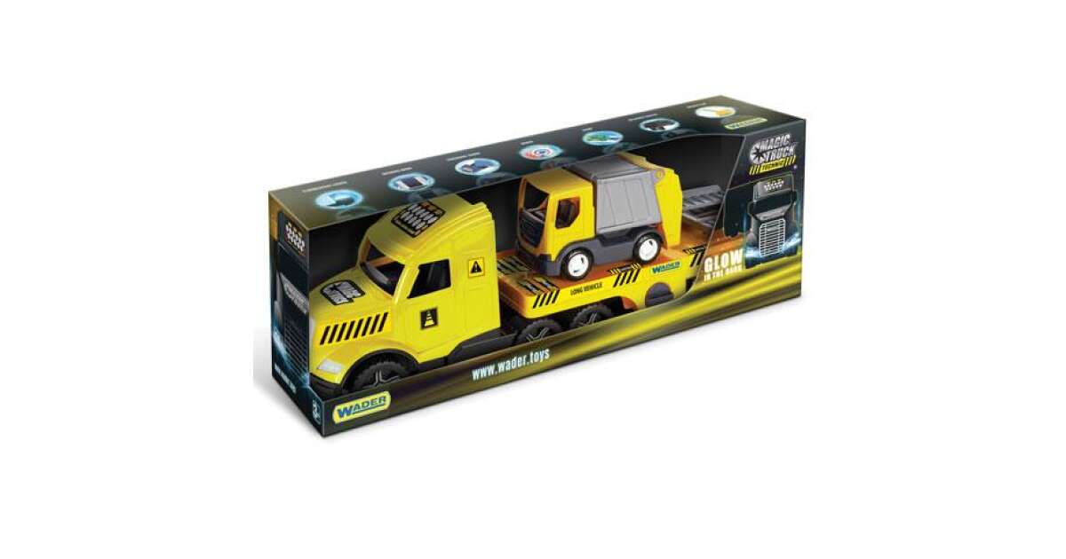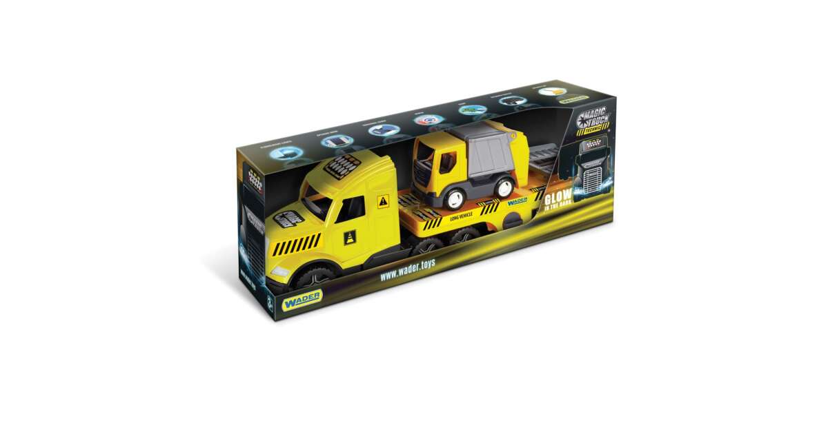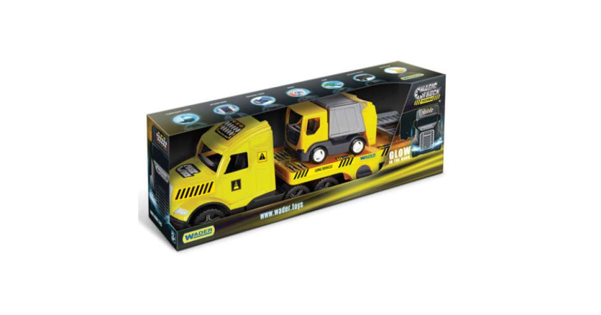 This huge 80 cm long Wader Magic Truck Technic truck is the perfect toy for every little builder! Equipped with illuminated headlights, the truck also carries a small garbage truck, which can be easily driven onto the trailer via the opening ramp. The set also includes handrails to make the game even more exciting.