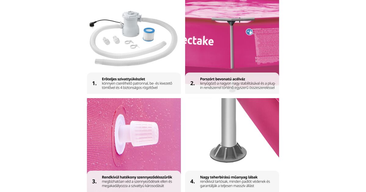 - Quick drainage: Thanks to the drain valve, the pool is emptied quickly and easily.