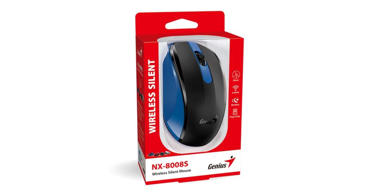 This blue and black Genius NX-8008S wireless mouse is perfect for everyday computer work. Its comfortable, quiet operation and precise tracking will boost your efficiency.