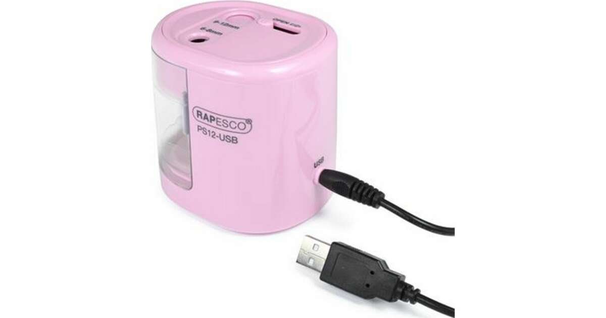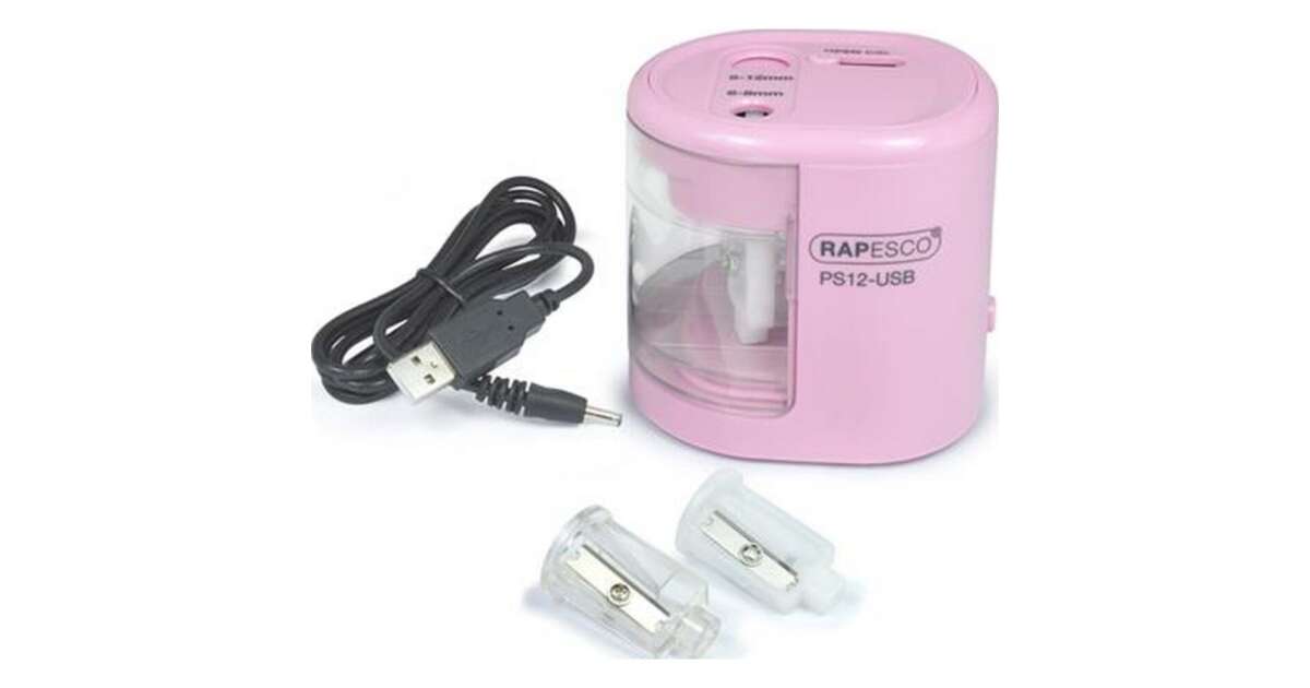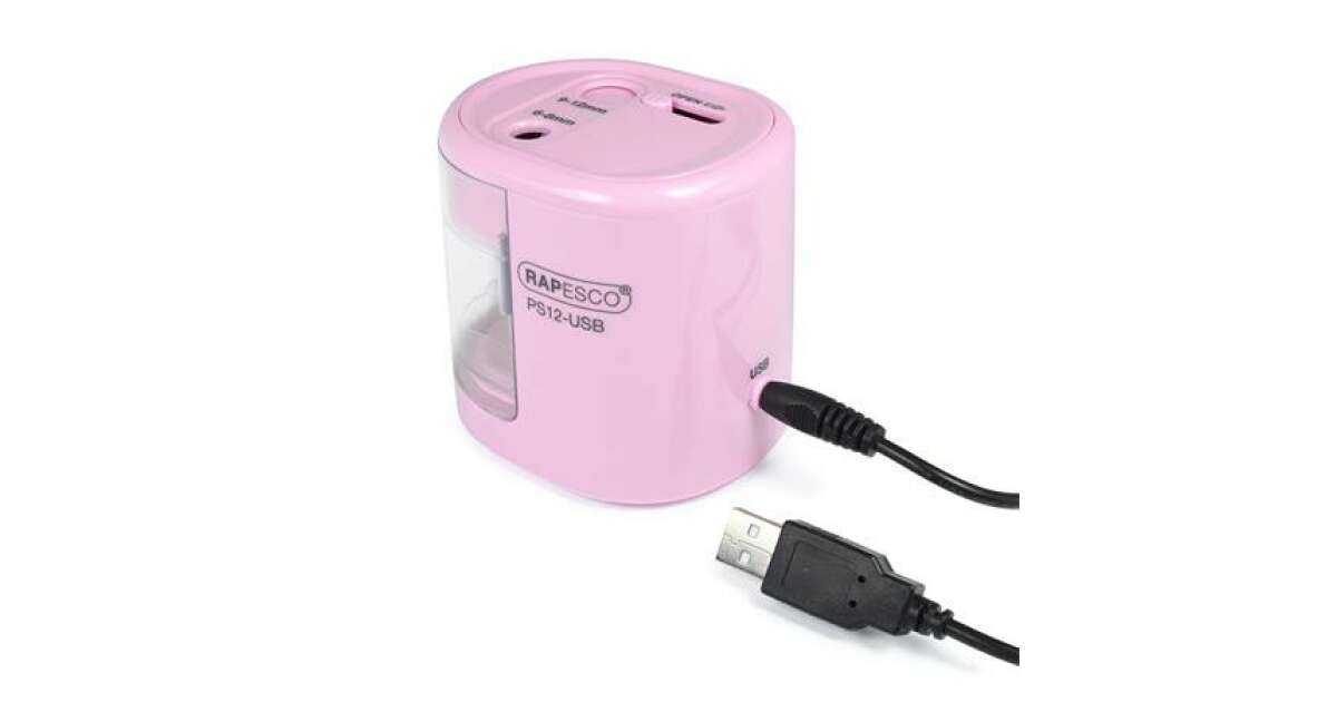 Rapesco "PS12-USB", two-hole, desktop, battery operated, with USB charger, pink sharpener description of