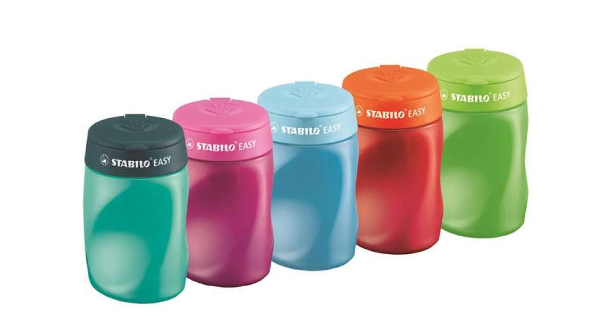This STABILO Easy three-hole pencil sharpener is perfect for everyday use. Its ergonomic design makes it comfortable to use, and the special grip makes sharpening easier. The built-in container keeps pencil shavings from scattering everywhere.