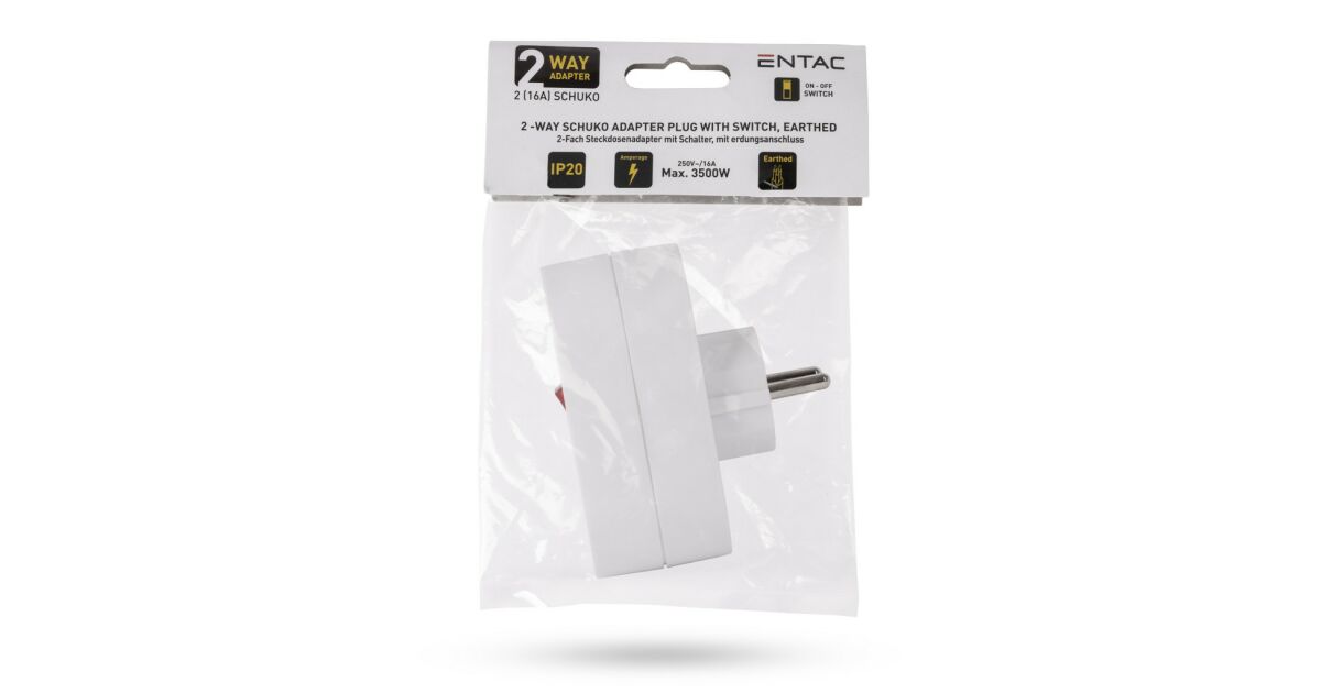 The Entac 2-socket adapter with switch offers a practical and safe solution for connecting everyday electrical devices.