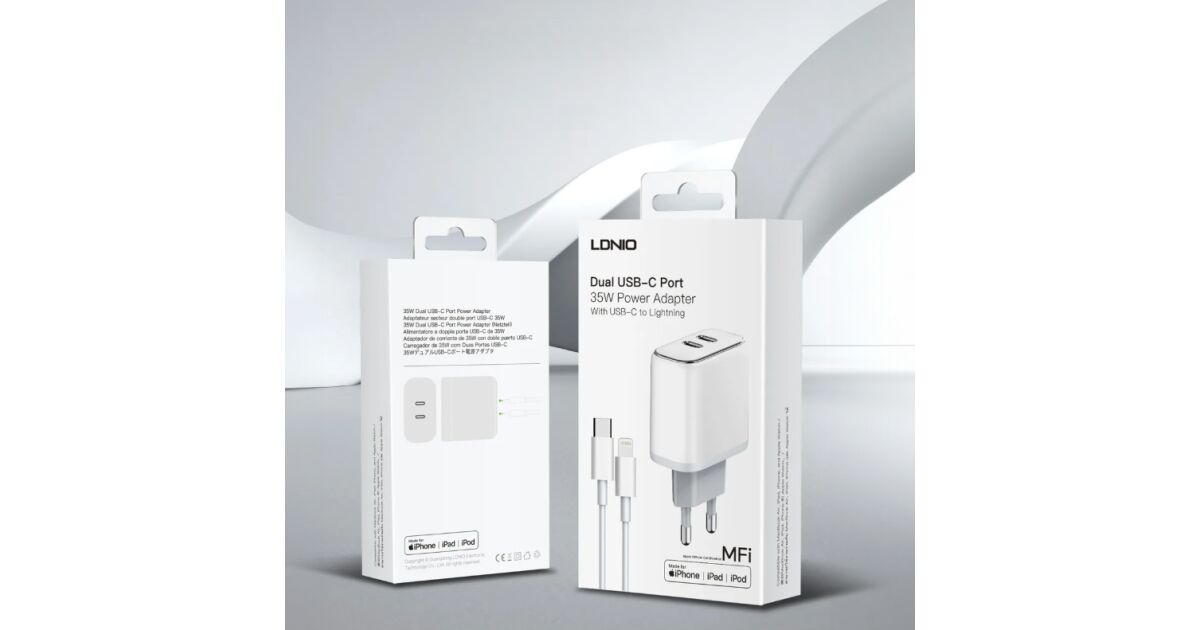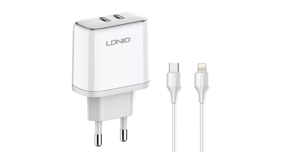 MFi wall charger LDNIO A2528M, 2xUSB-C, USB-C to Lightning 35W description of