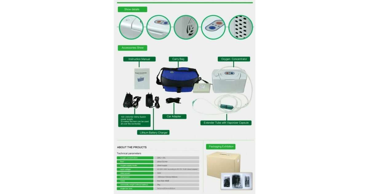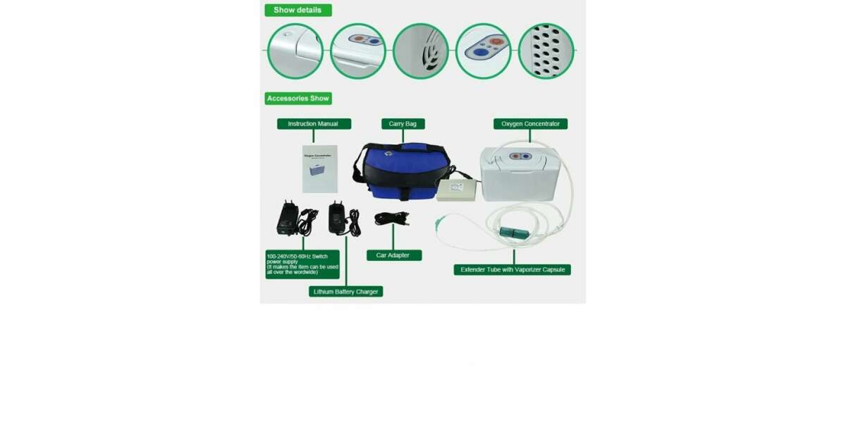 - Includes: oxygen concentrator, mains adapter, carrying bag, extender tube with nebulizer capsule, user manual (in English!), rechargeable lithium battery, battery charger, nasal cannula, power cord, car charger