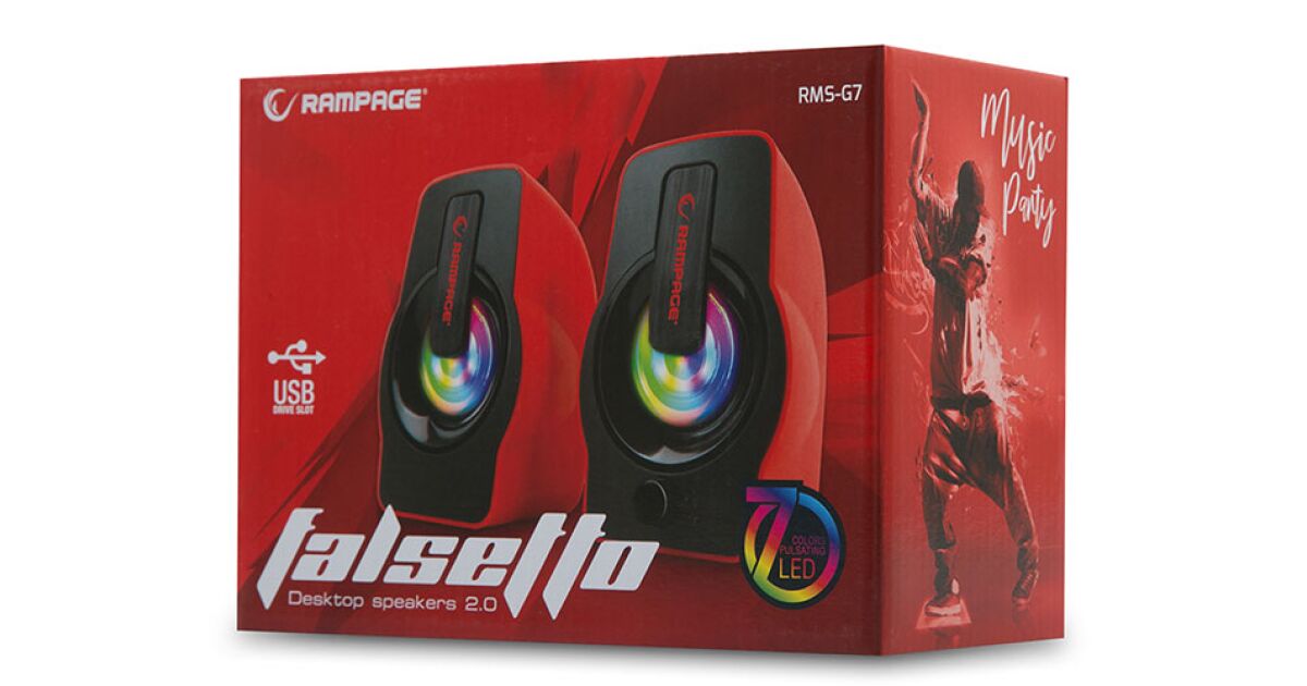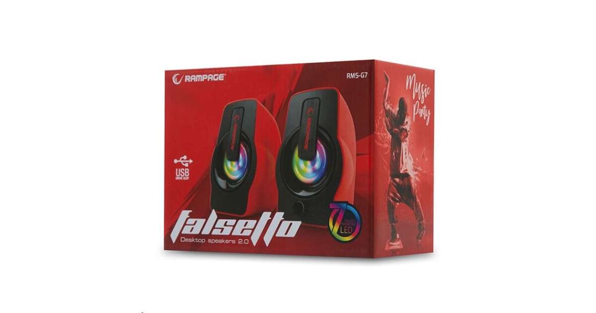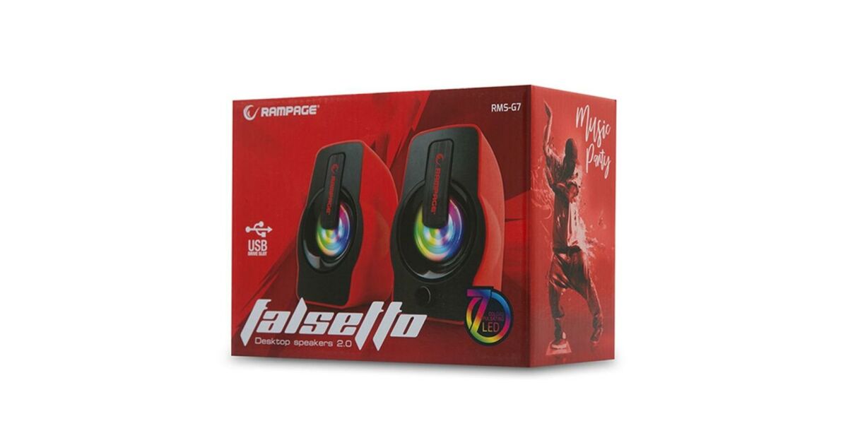 The Rampage RMS-G7 Falsetto 2.0 speakers are the perfect choice if you want excellent sound quality and a spectacular look. Thanks to their compact size, they are ideal for desktop use, while their RGB LED lighting enhances the atmosphere.