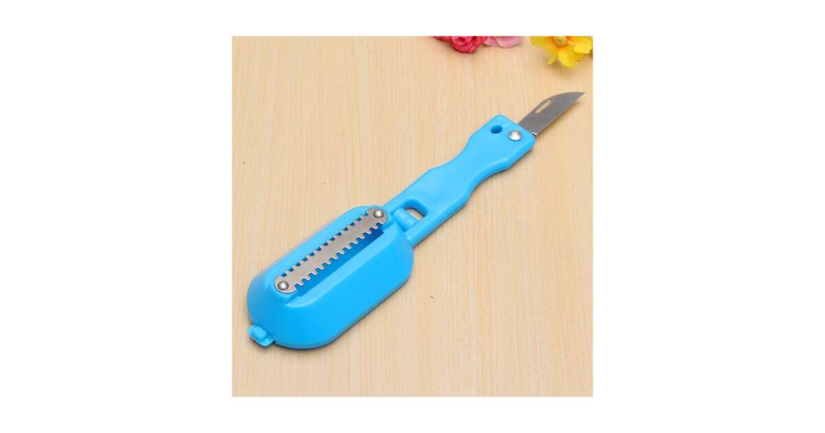 Fish Scaler with Storage Container + Built-in Mini Stainless Steel Blade for Fish Scales, Blue description of