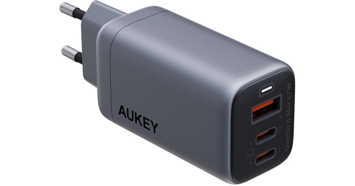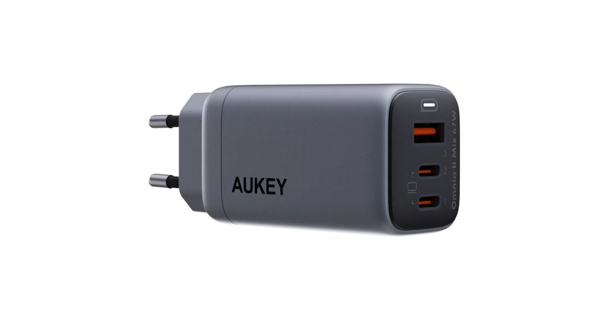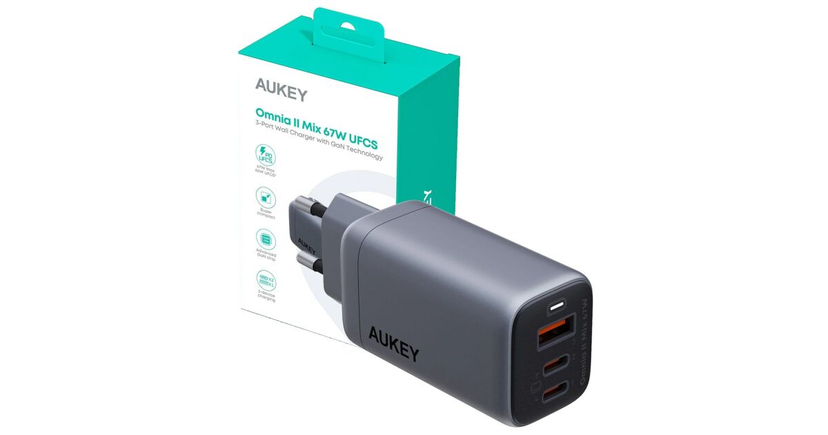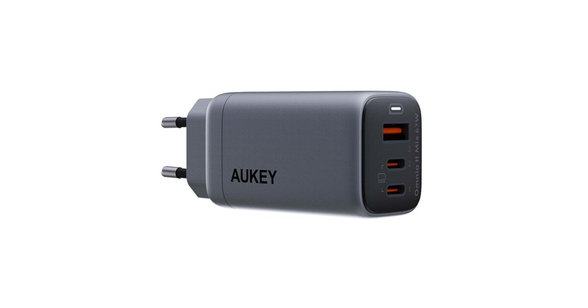 ManufacturerAukeyModelPA-B6UColorGrayPorts1x USB-A, 2x USB-COutput power67WTechnologyGaN IIICharging standardsUFCS, Samsung Super Fast Charging 2.0, Power Delivery (PD)