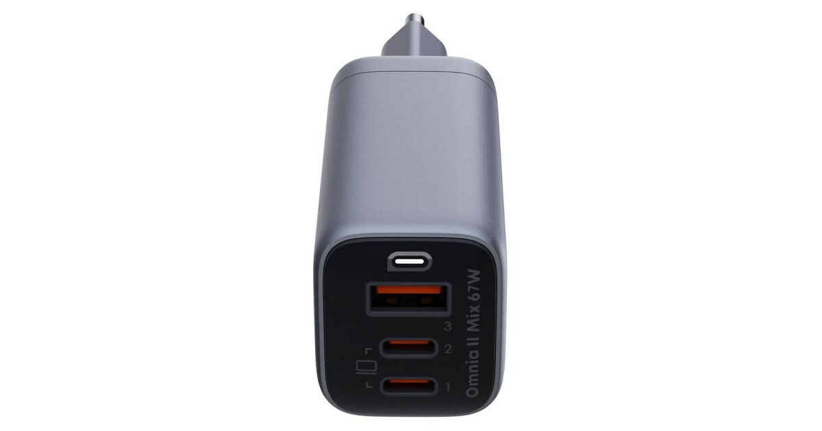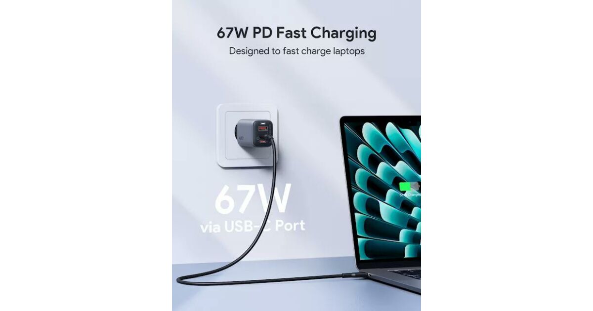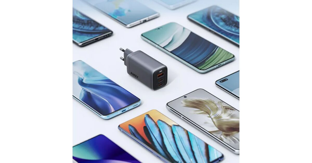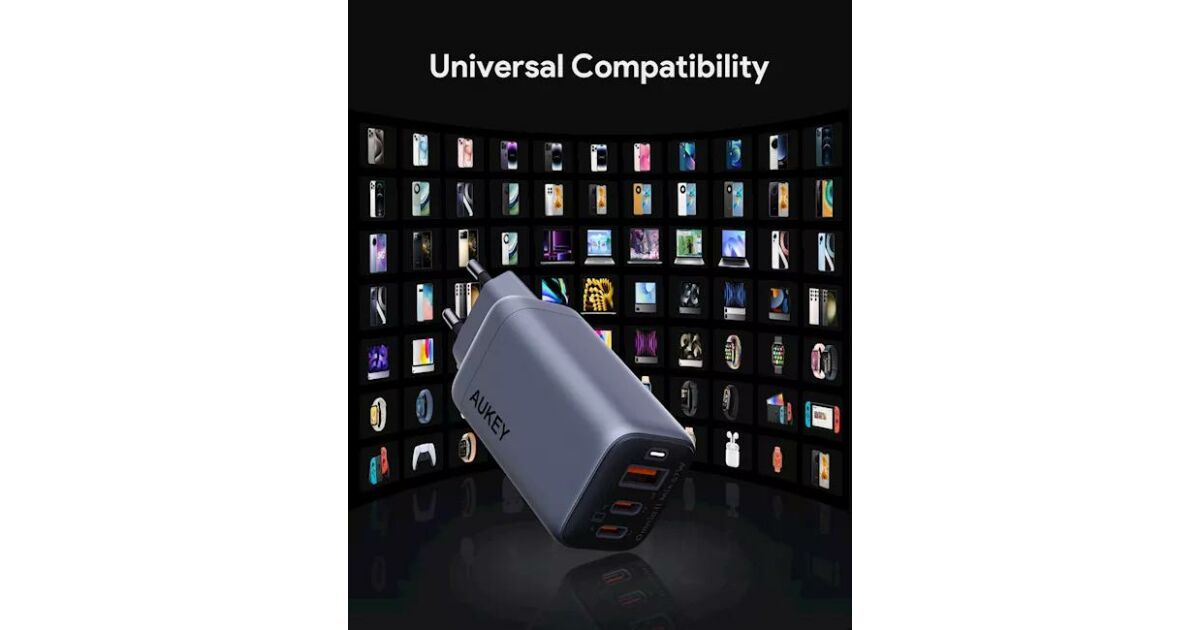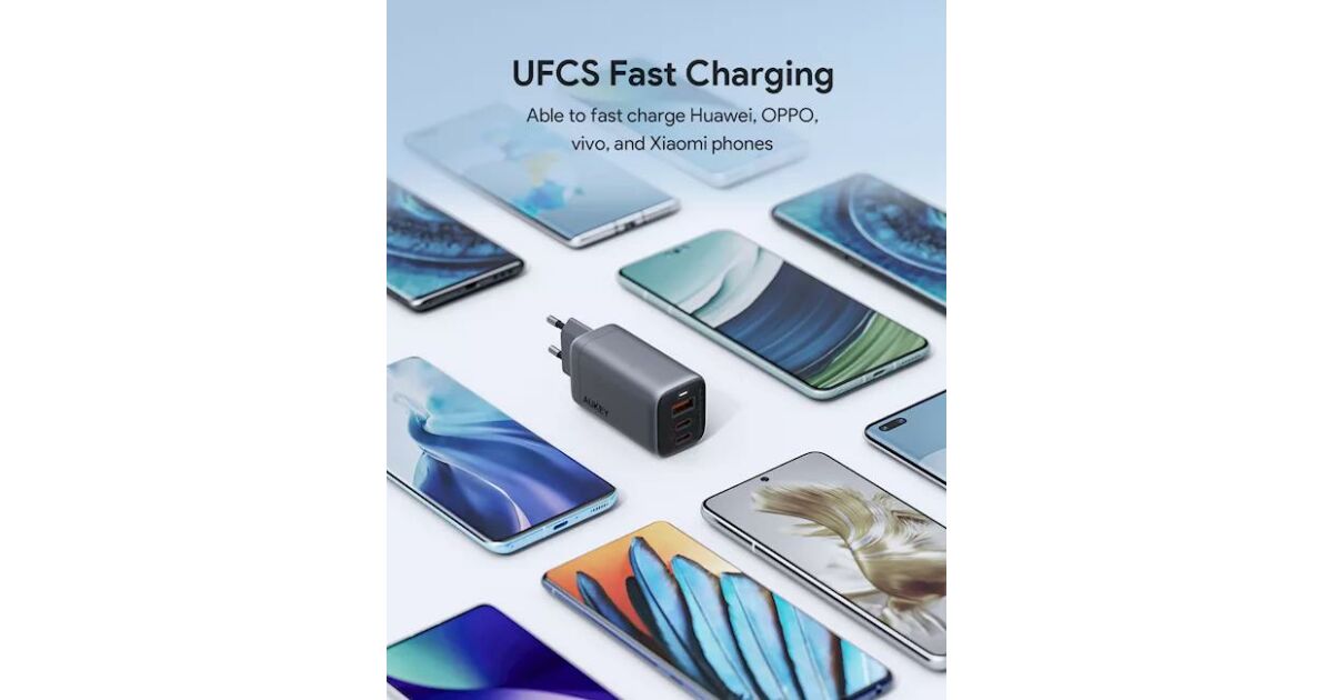 ManufacturerAukeyModelPA-B6UColorGrayPorts1x USB-A, 2x USB-COutput power67WTechnologyGaN IIICharging standardsUFCS, Samsung Super Fast Charging 2.0, Power Delivery (PD)
