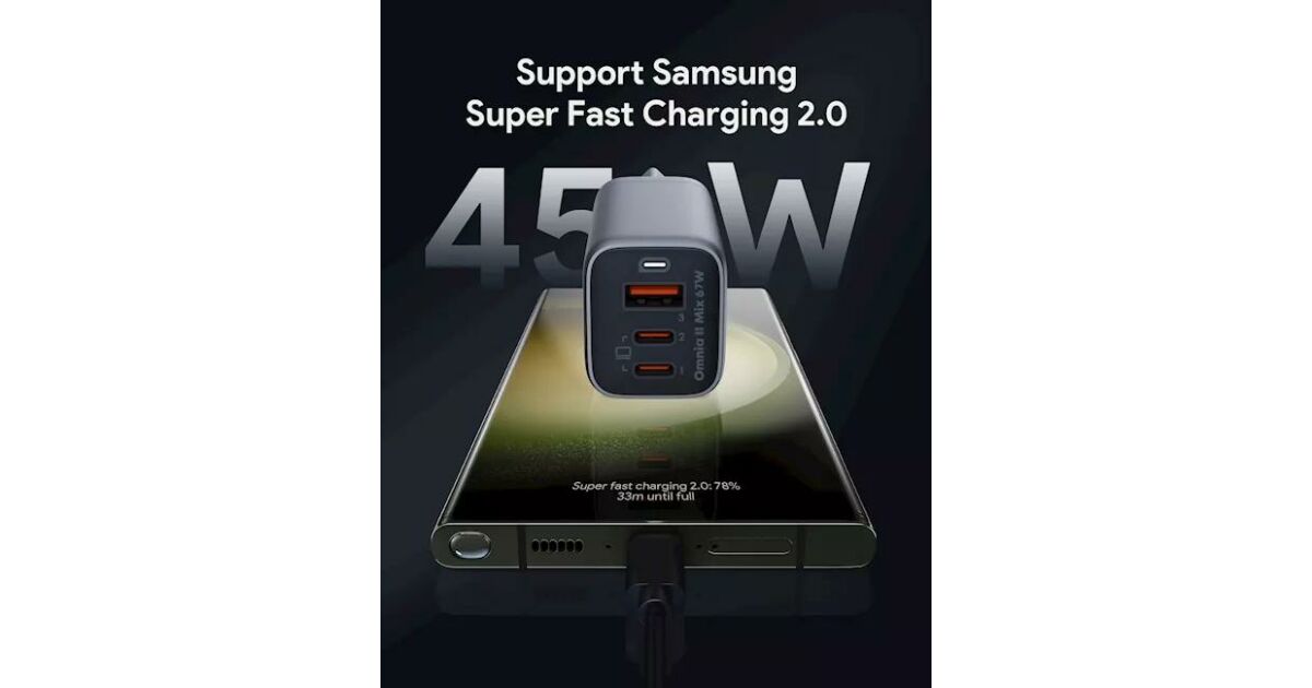 The charger supports the 45W UFCS and Samsung Super Fast Charging 2.0 standards, allowing you to quickly charge devices from brands such as Huawei, OPPO, vivo, Xiaomi and Samsung's latest smartphones. This means your devices will be charged in less time, which is especially useful when you need a quick charge. In addition, with a 67W USB-C port, the charger is able to quickly charge laptops, providing performance that rivals dedicated power adapters. This solution means you can use one compact device to charge all your devices.