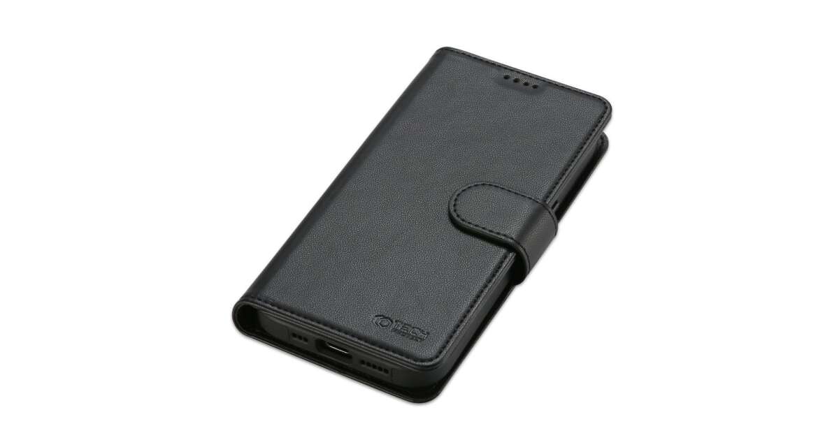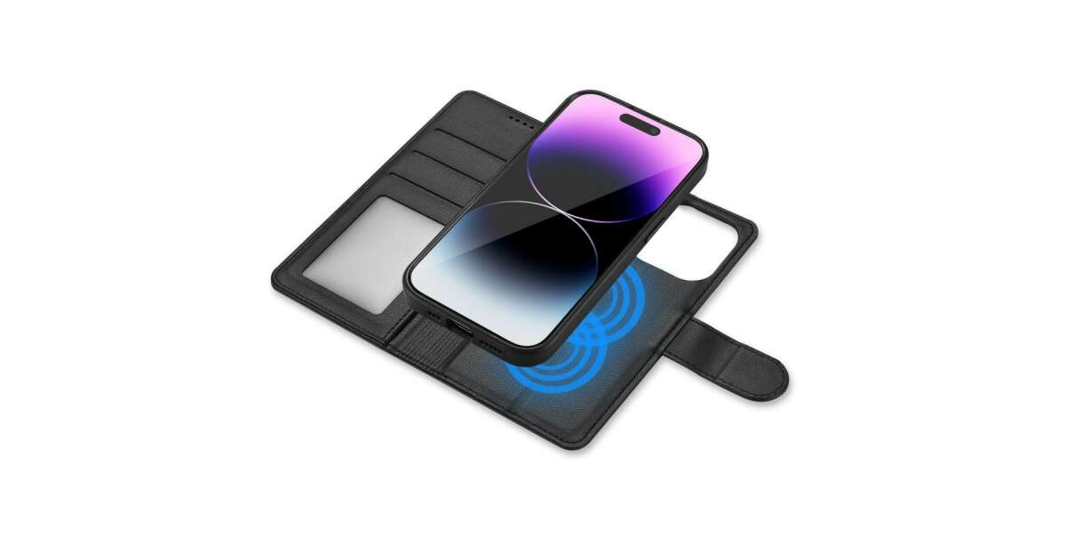iPhone 15 Pro Tech-Protect Wallet Case - MagSafe compatible black leather book case with flap description of
