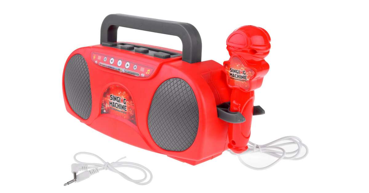 Red Radio-Shaped Karaoke Set with Speaker and Microphone description of