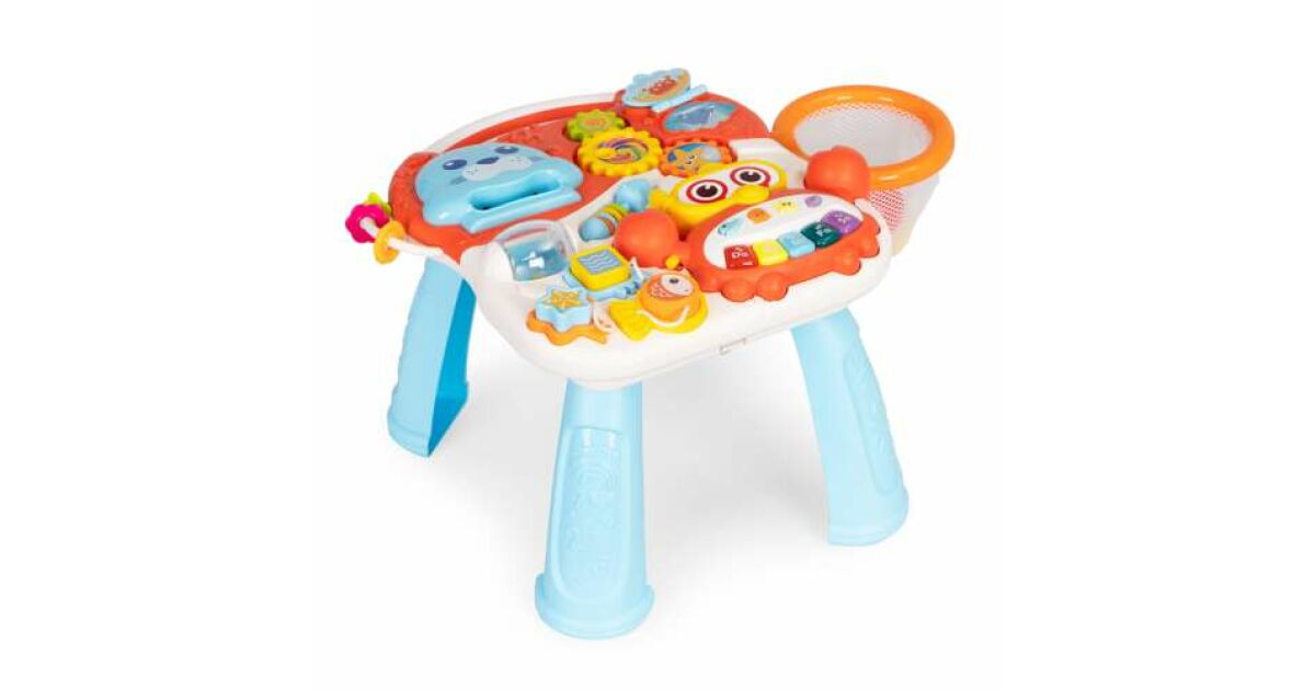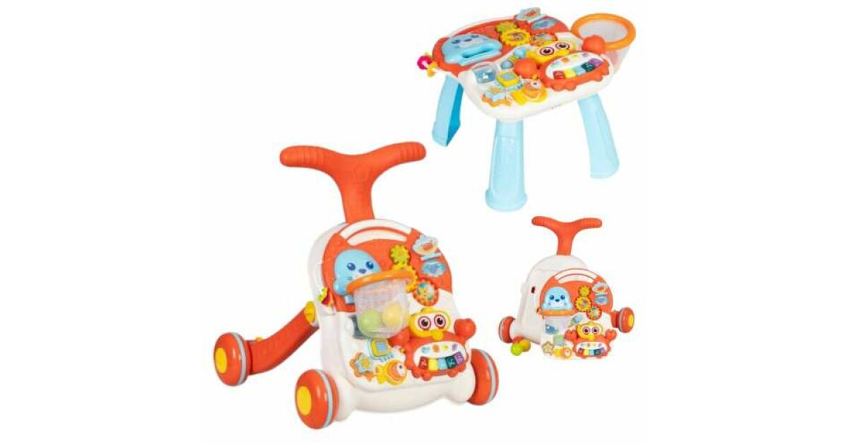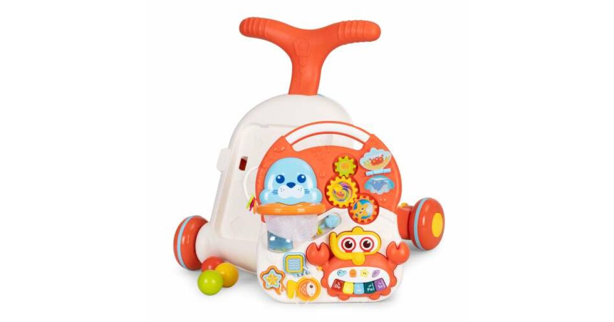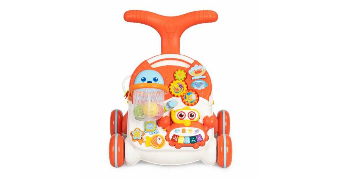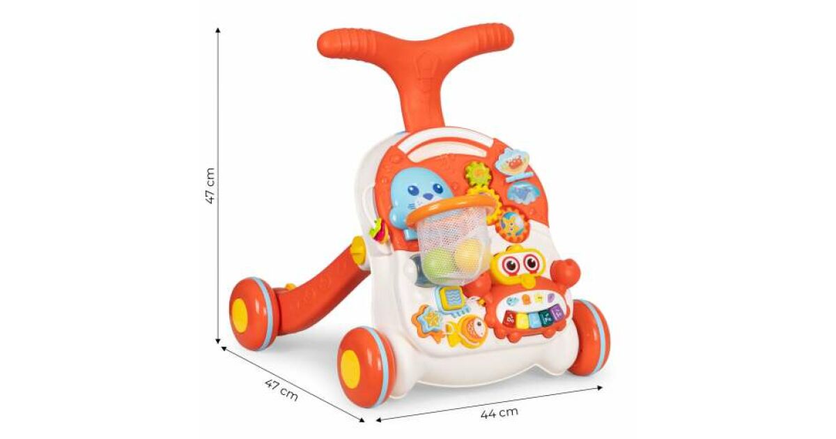 The front of the pusher is a detachable, colourful panel full of movable elements that rotate, slide and push. Your toddler will also find a small keyboard that detaches from the pusher. The crab-shaped keyboard makes sounds, plays tunes and the LEDs flash to the rhythm, which any child will love and will quickly become a favourite toy. An added attraction is the basket, into which you can throw 3 colourful balls