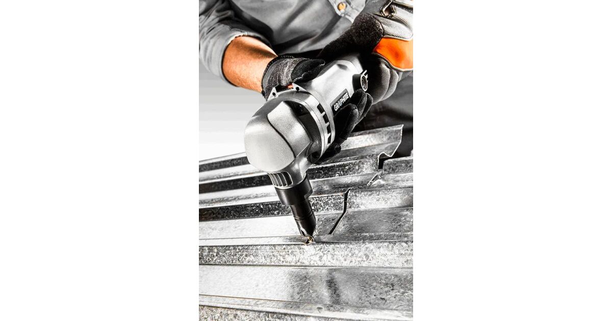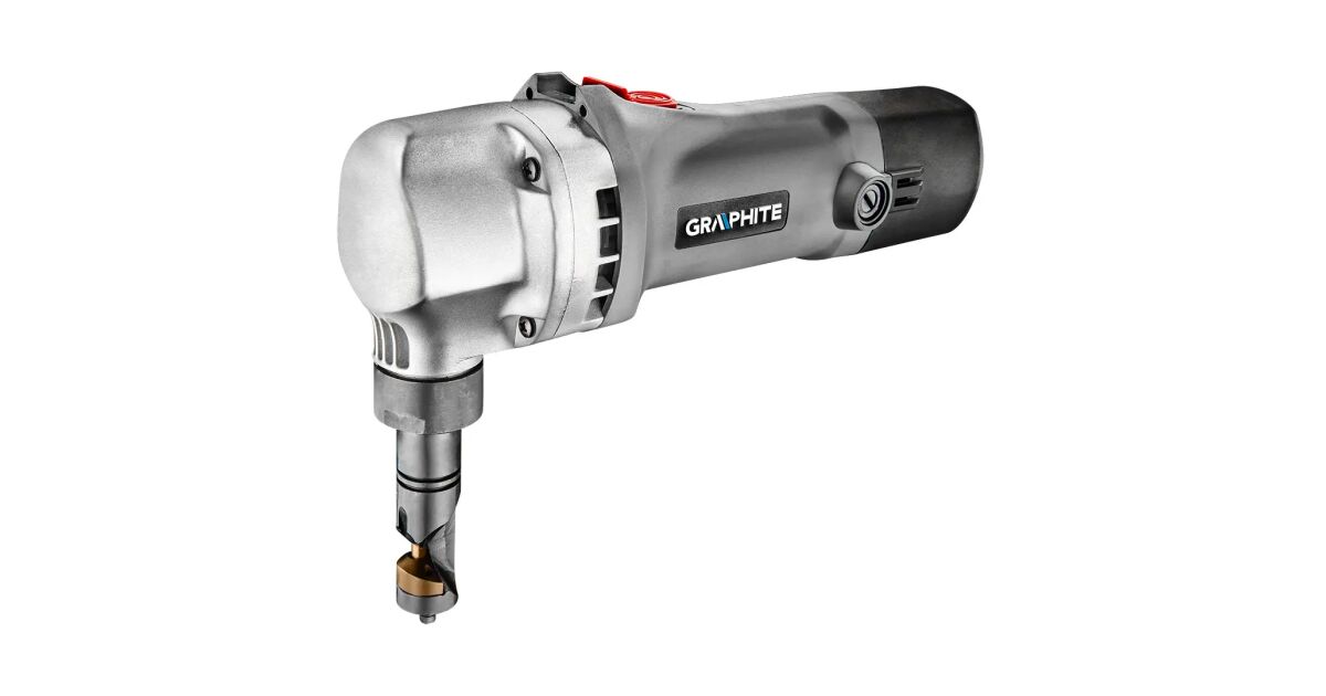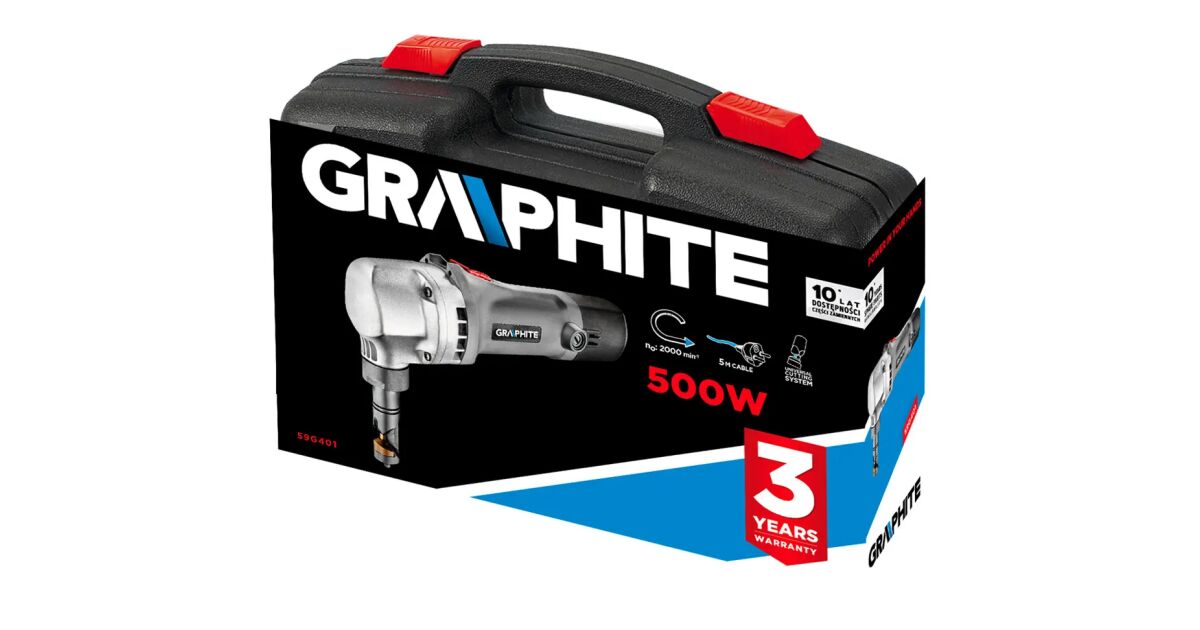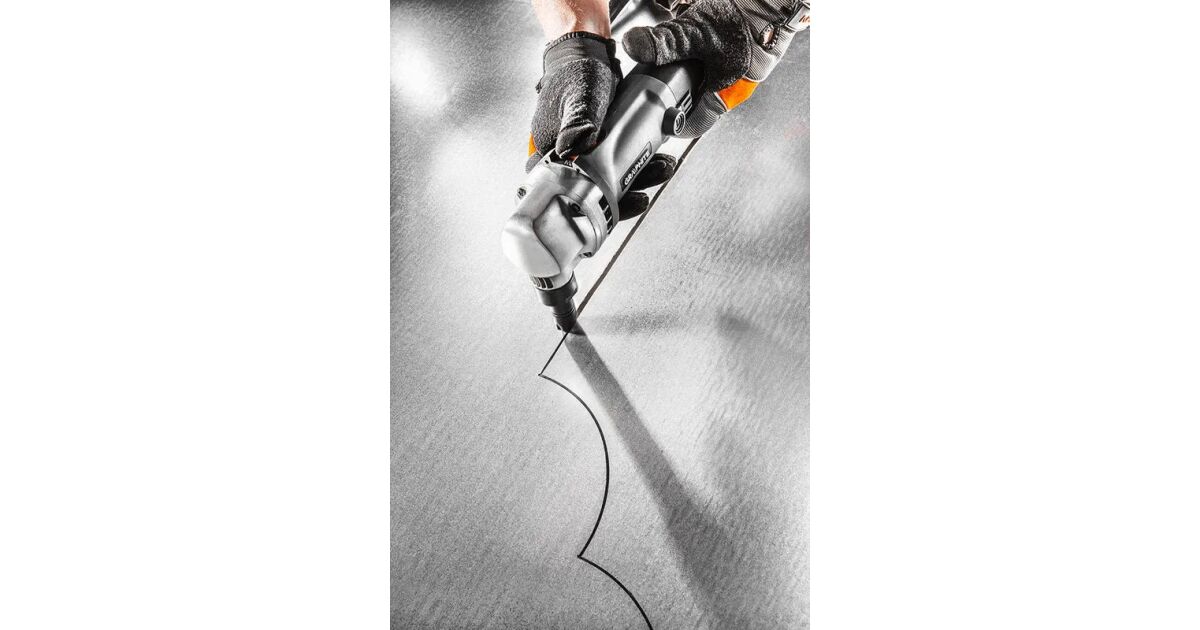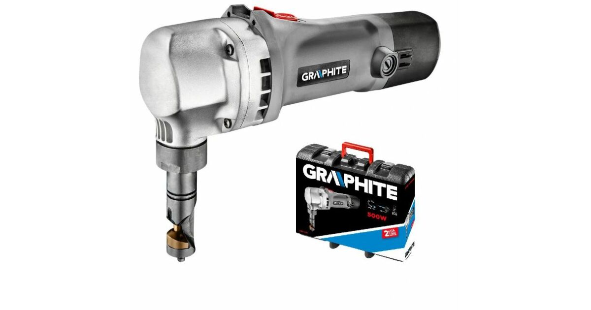 The 500 W professional GRAPHITE plate cutting machine works on the principle of continuous punching, therefore removing 5mm of material along the cutting line (article number 59G401). The plate cutting shears can be used to cut steel plates up to 1,6 mm thick and aluminium plates up to 2,5 mm thick. During cutting, blades cut a strip 5 mm wide. The tool is characterised by its high strength, which is also ensured by the aluminium housing of the drive unit. The matrix holder can be rotated by 90° to change the cutting direction. The maximum cutting cycle of the shears is 2 000 cuts per minute. The guillotine is equipped with a locking device to prevent accidental start-up and a starter switch locking device for continuous operation. The mains connection cable of the tool is 5 m long. The worn carbon brushes can be replaced by hand. The tool comes with mounting wrenches and a handy carrying case. CE certification proves compliance with European standards.