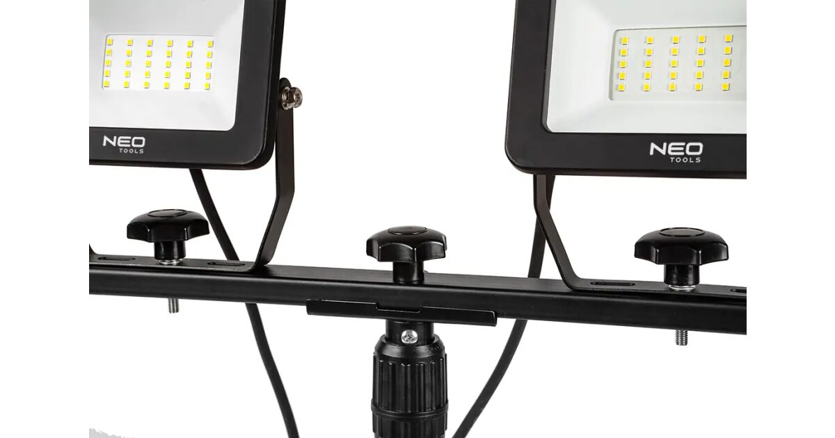 This NEO Tools double LED floodlight is the perfect choice for indoor and outdoor work where you need a strong and reliable light source. Thanks to the telescopic stand, it can be easily adjusted to the desired height (max. 1.8m), and the lighting direction is also adjustable.