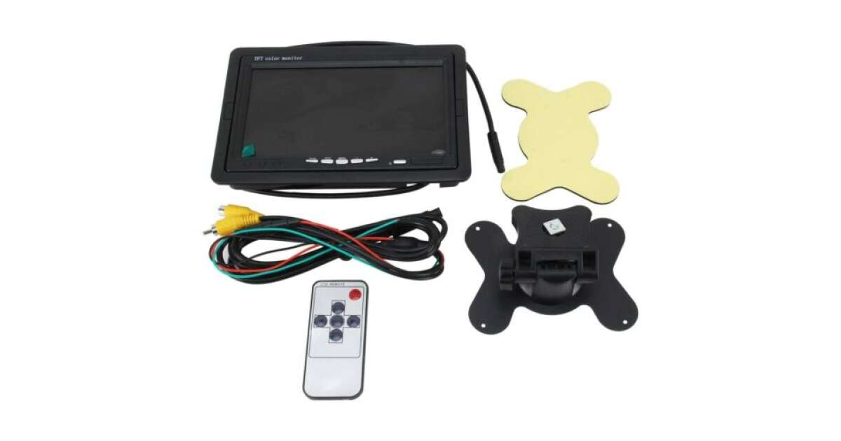 Package contents: 2 cameras, 7" LCD monitor, tilting monitor mount, remote control, cable set.