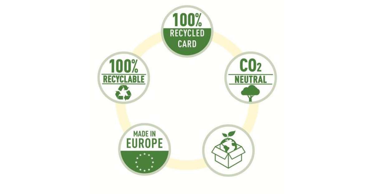 The product is made from 100% recycled materials and is 100% recyclable. It's climate-neutral and has FSC and Blue Angel certifications. It comes with a label, minimizing unnecessary packaging waste. Made in Europe.