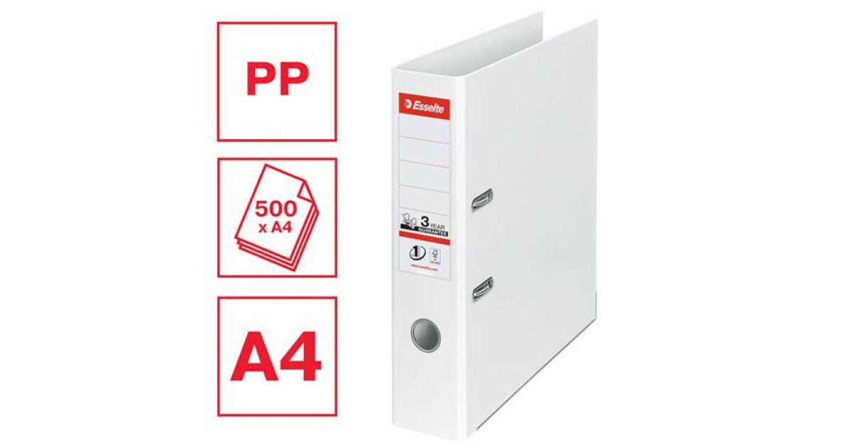 This white Esselte Standard Vivida lever arch file is perfect for keeping your A4 documents organized. The 75 mm spine can hold up to 500 sheets (80g). Made from high-quality, durable materials, it will serve you reliably for a long time.
