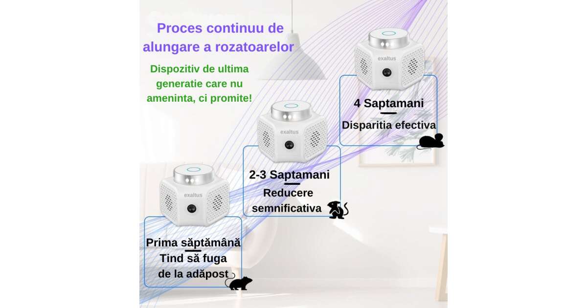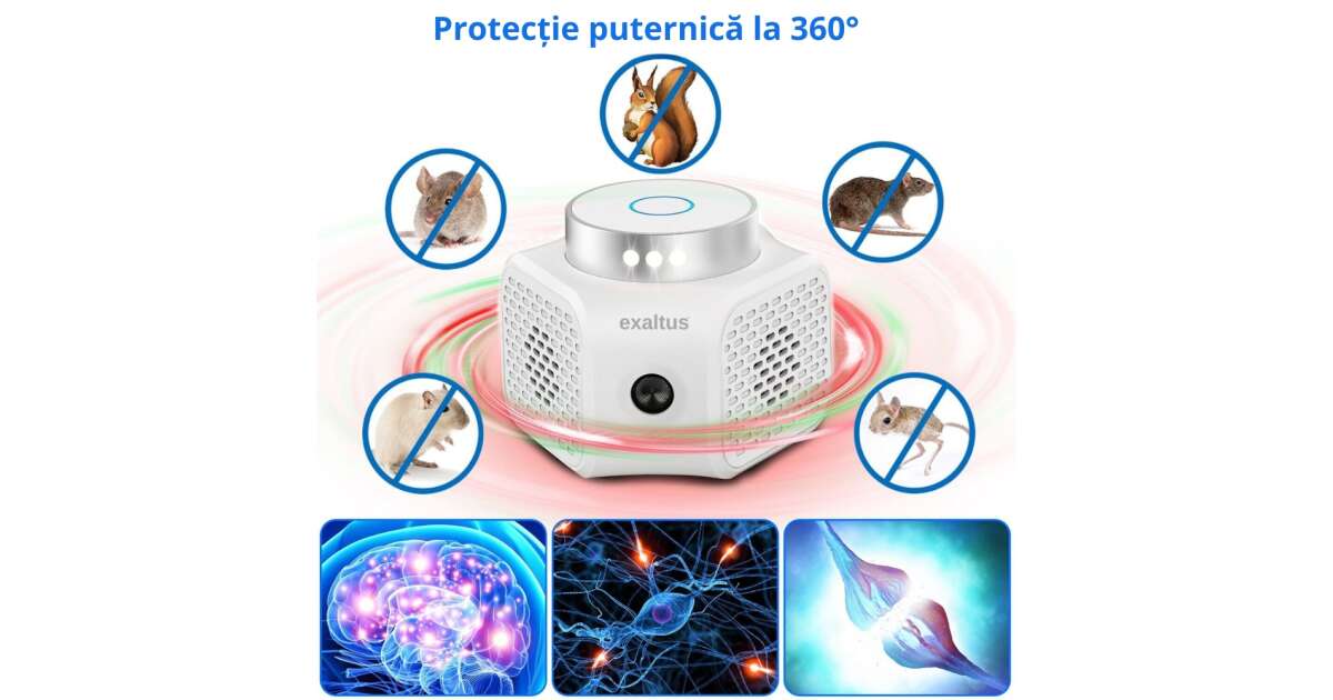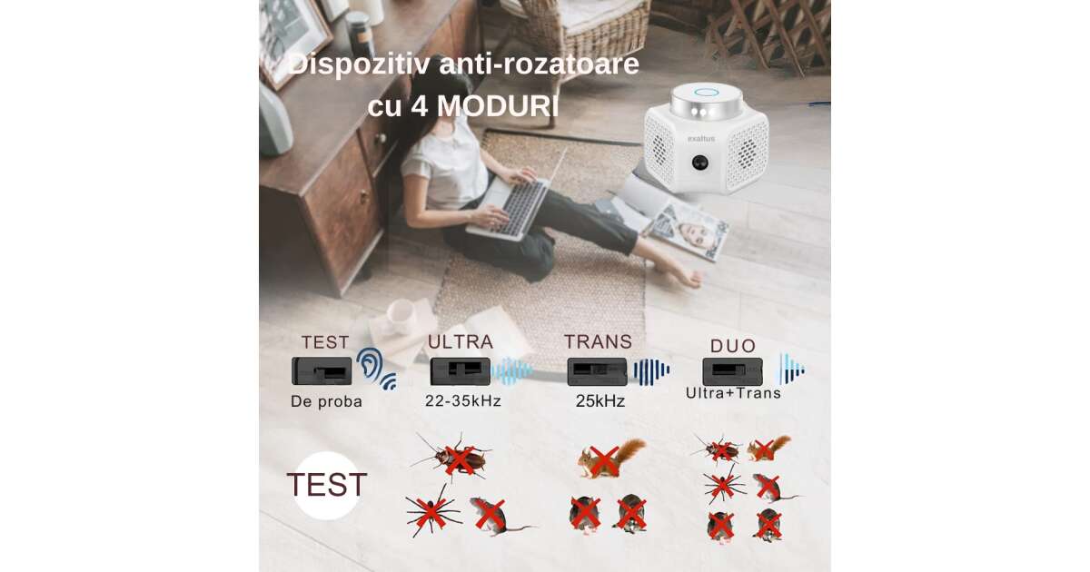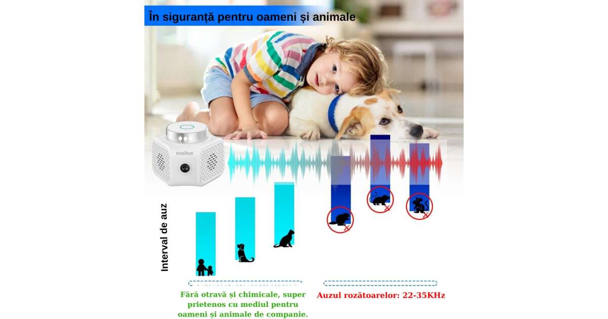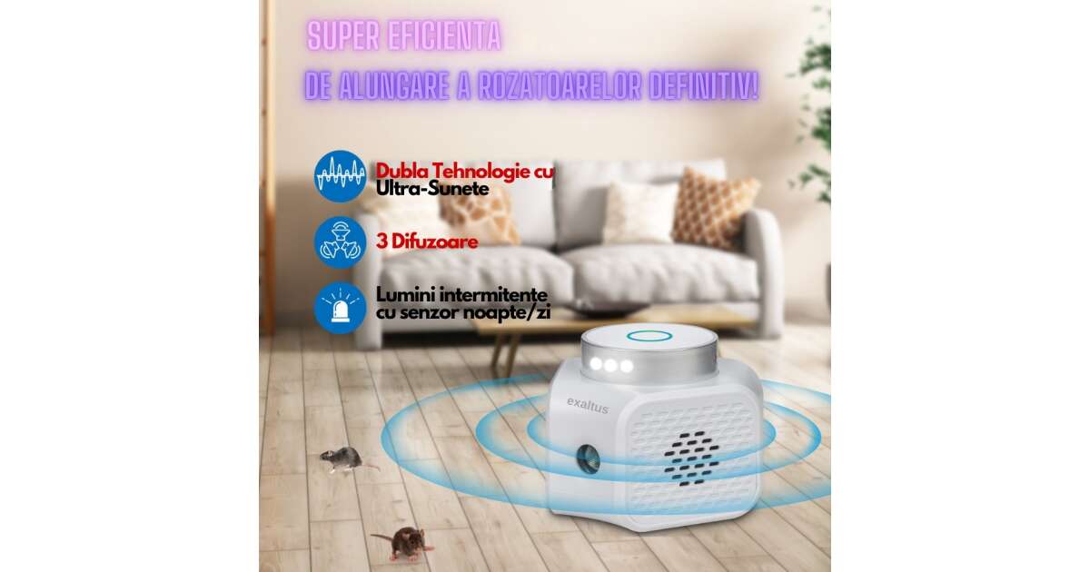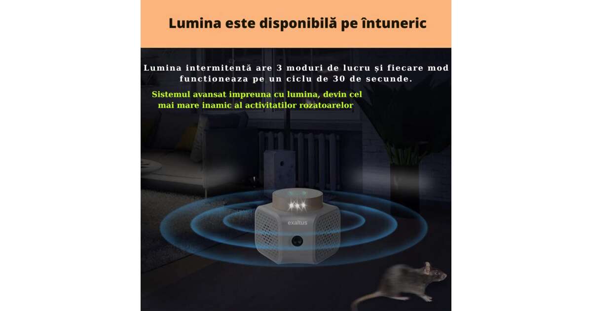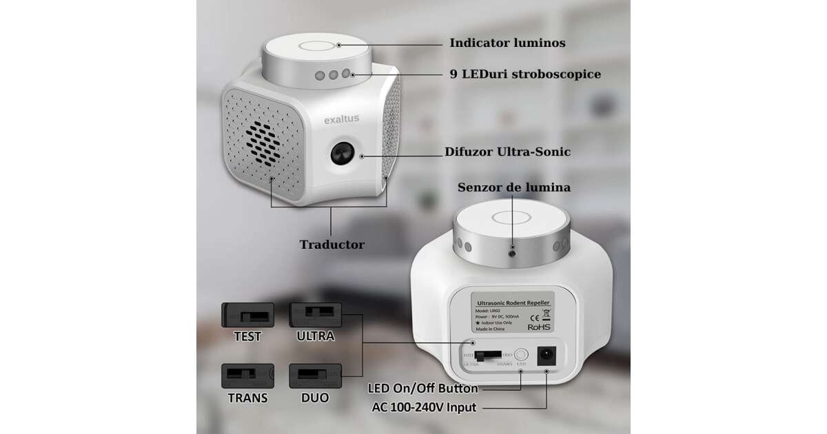 Rodent Repeller, Exaltus®, anti-mice, rats, dual ultrasonic technology, 120m² coverage and 360⁰ action, 4 levels, flashing lights, frequency 22-35/25kHz, safe for humans and pets description of