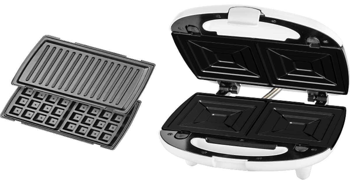 - 3 interchangeable plates (sandwich, panini, waffle)