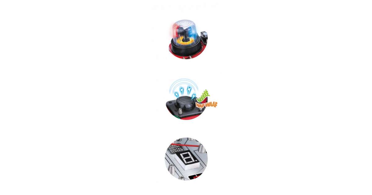 - 21 safe components: LEDs, light sensor, touch switch, transistors, resistors, speaker, and rotating light. No soldering required! 🛠️