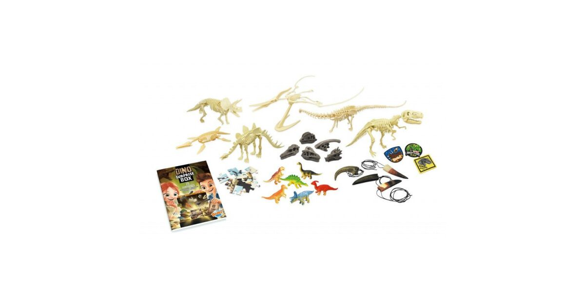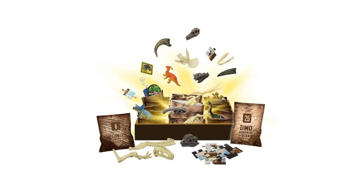 Get ready for an exciting paleontological adventure with the Dino Surprise Box! This awesome set contains 25 surprises to help you explore the world of dinosaurs. Inside the box you'll find bones, figures, puzzle pieces, and lots more cool stuff.