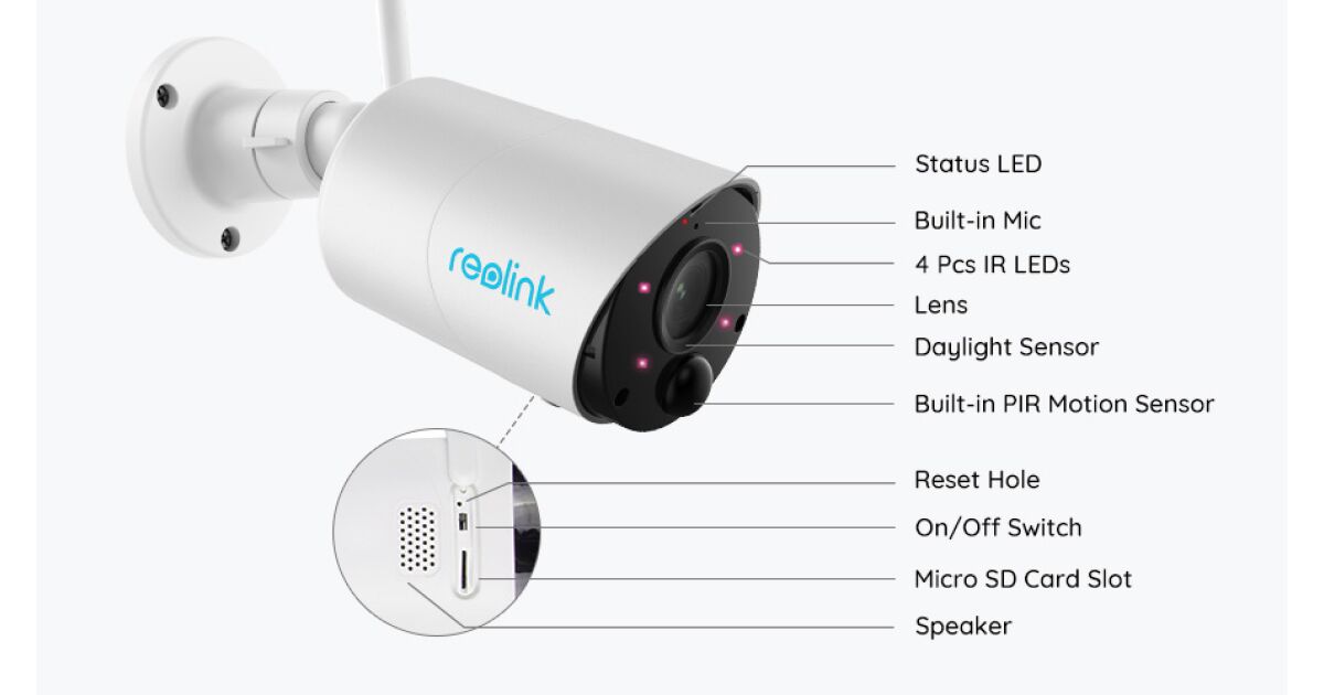 Reolink Argus Eco autonomous surveillance camera with solar panel, WiFi, rechargeable battery, night vision, Micro SD card slot, 1080p Full HD resolution, and motion detection. description of