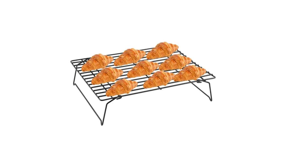 This handy black metal cooling rack is the perfect solution for quickly and evenly cooling cakes, pies, breads, donuts, and other baked goods. Thanks to its non-stick surface, baked goods are easy to remove. The sturdy metal construction resists bending and warping, ensuring a long lifespan.