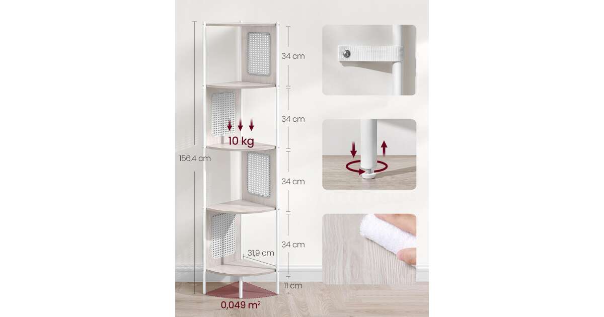 VASAGLE Boho Corner Shelf, Metal Frame, MDF Shelves and Polyrattan Panels, 32x32x156cm, White description of