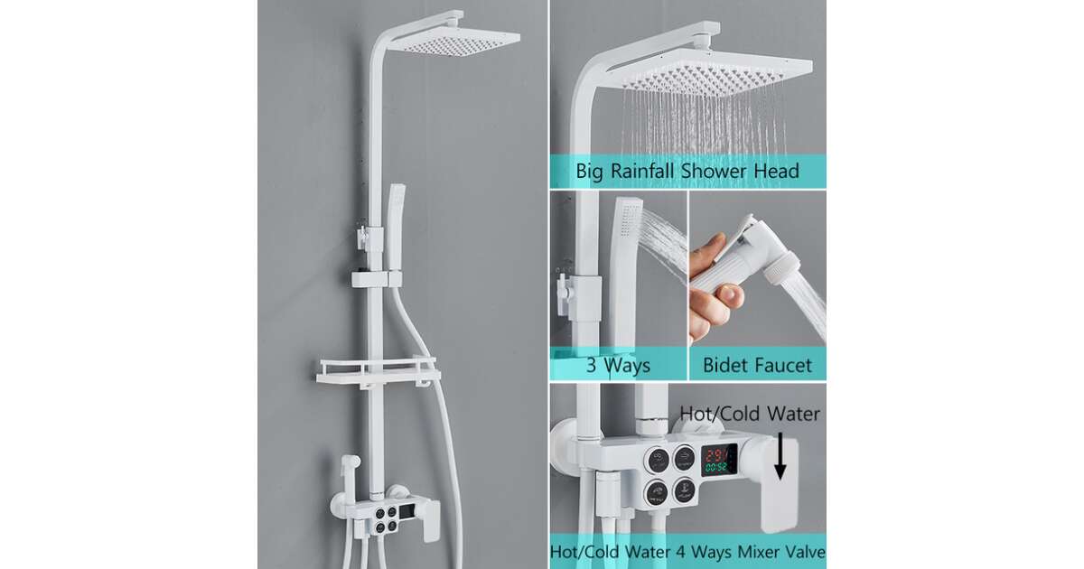 Blackswan M134 Shower Column, adjustable white model, 120 cm, with movable tap, high-pressure shower head and digital display description of
