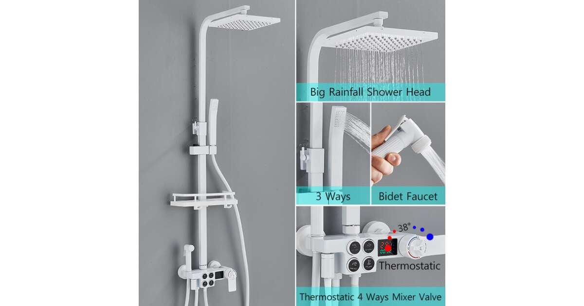 Blackswan M139 Shower Column, Adjustable White Model, 110 cm, with Thermostat, Movable Hand Shower, High-Pressure Shower Head and Digital Display description of