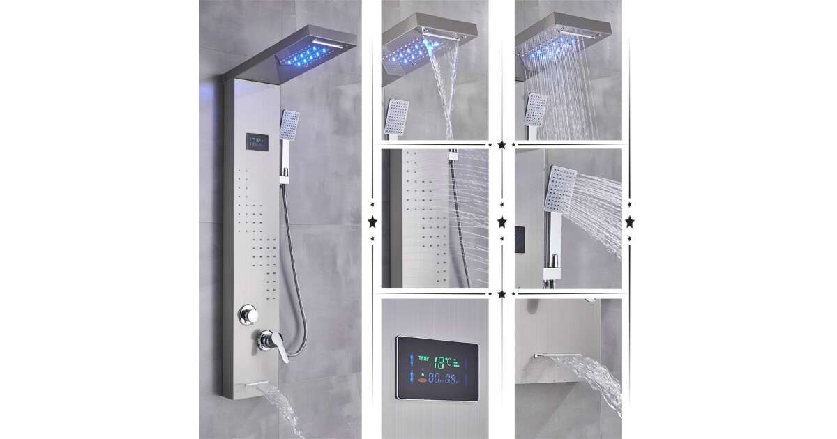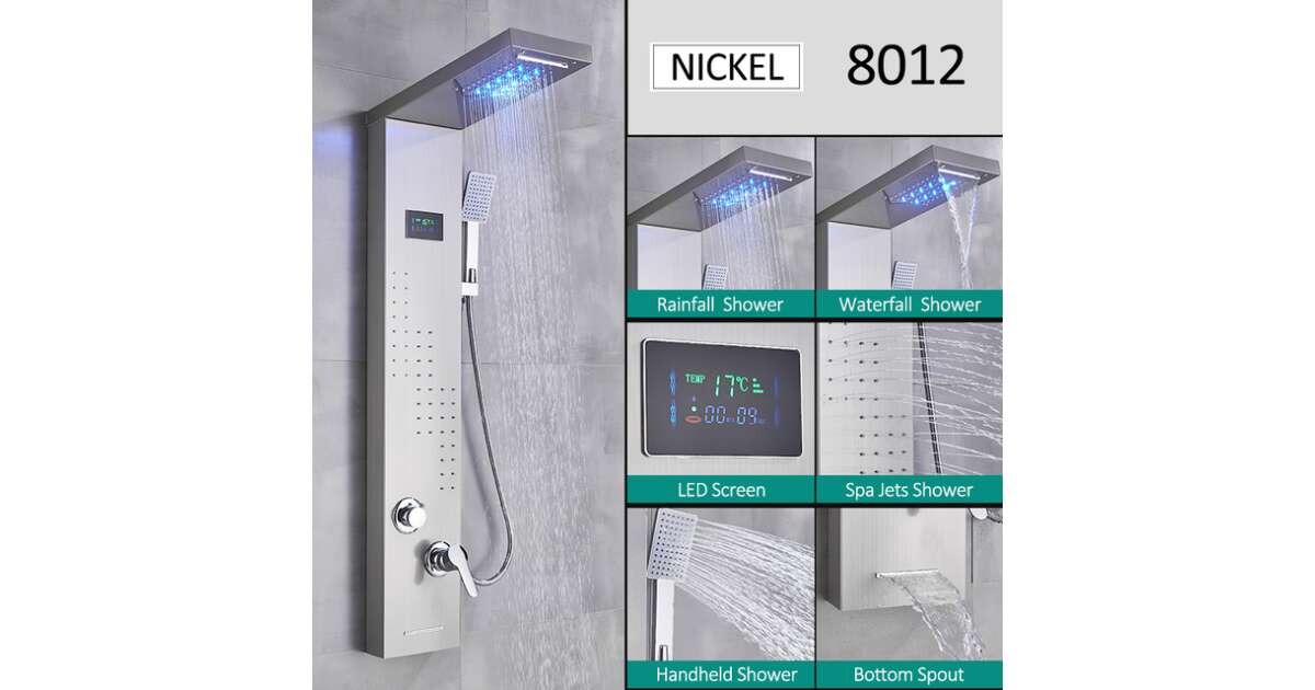 Blackswan M8012 Shower Panel, Nickel model with Waterfall Tap, Digital Display, LED and SPA functions, 113 cm description of