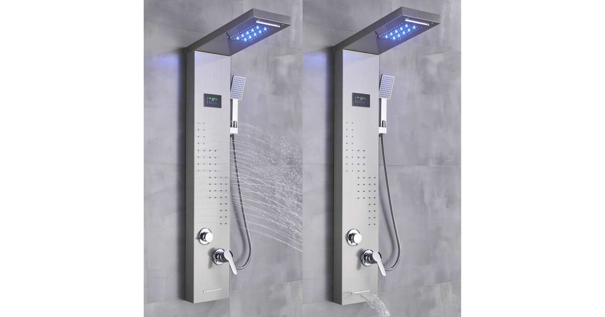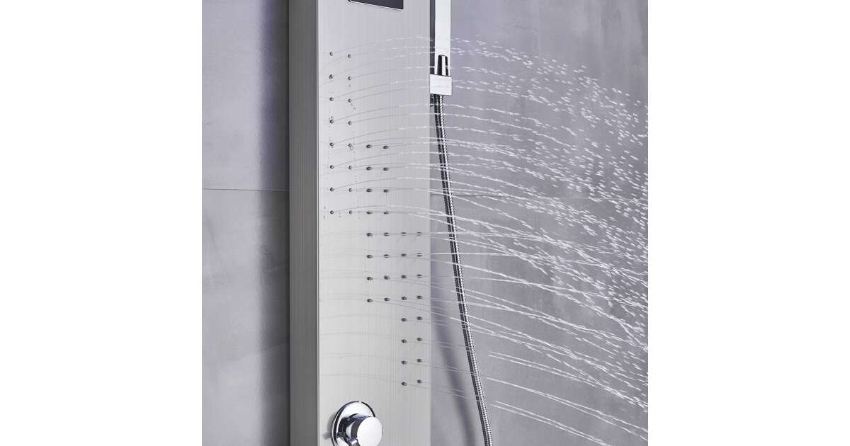 Enjoy the perfect shower experience with this stylish and functional Blackswan M8012 shower panel! The nickel-colored, 113 cm high panel features a waterfall shower, hand shower, SPA jets, and LED lighting, all complemented by a practical digital display where you can check the temperature and time.