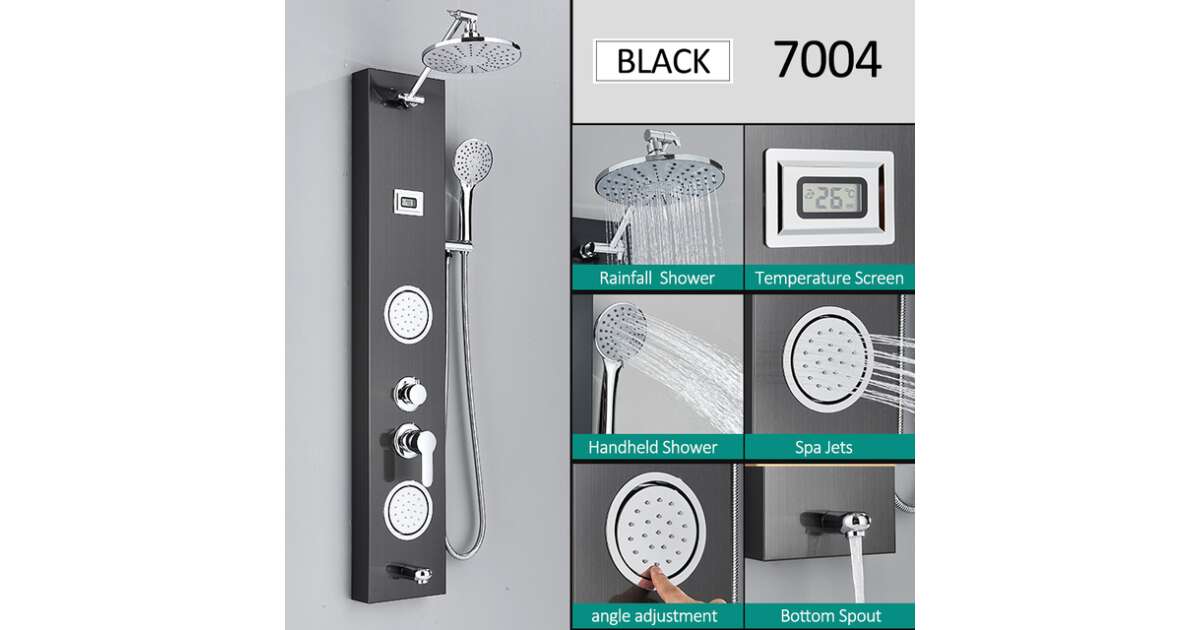 Blackswan Shower Panel, M7004 model, black, with shower head, digital display, tap and SPA functions, size 111 cm description of