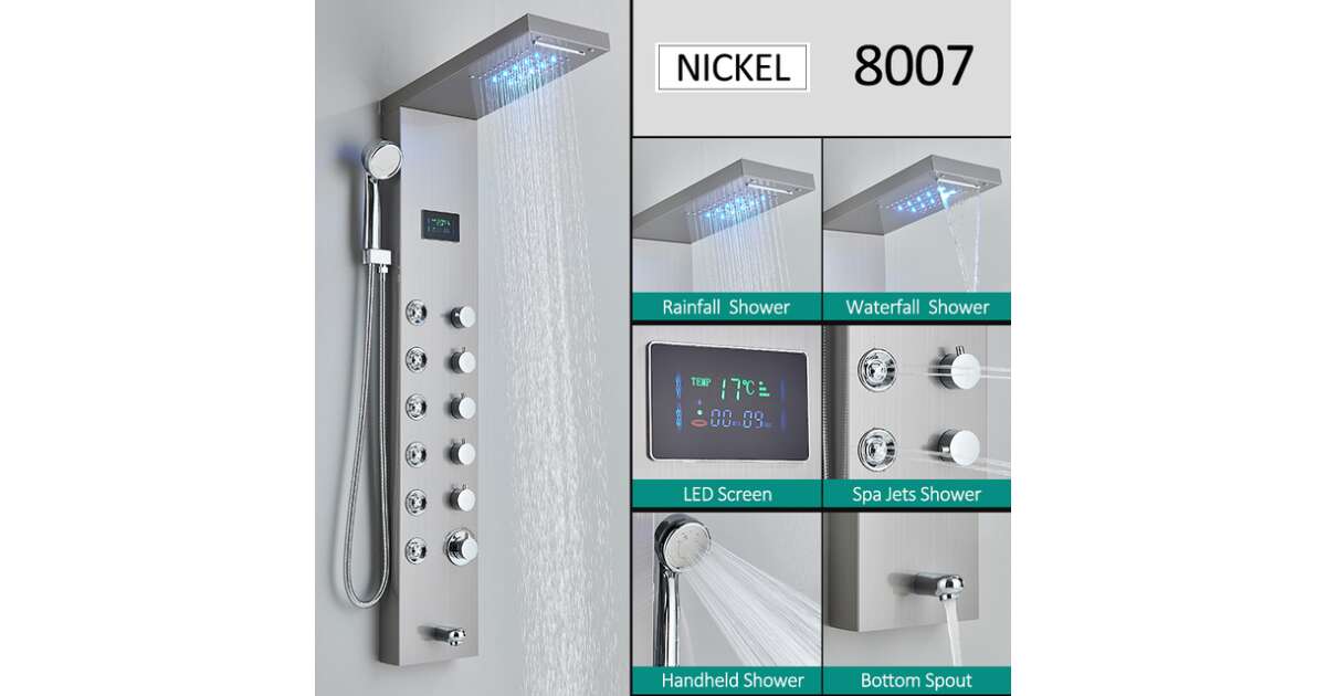 Blackswan Shower Panel, M8007 model, nickel finish with faucet, digital display, LED and SPA functions, 126 cm description of