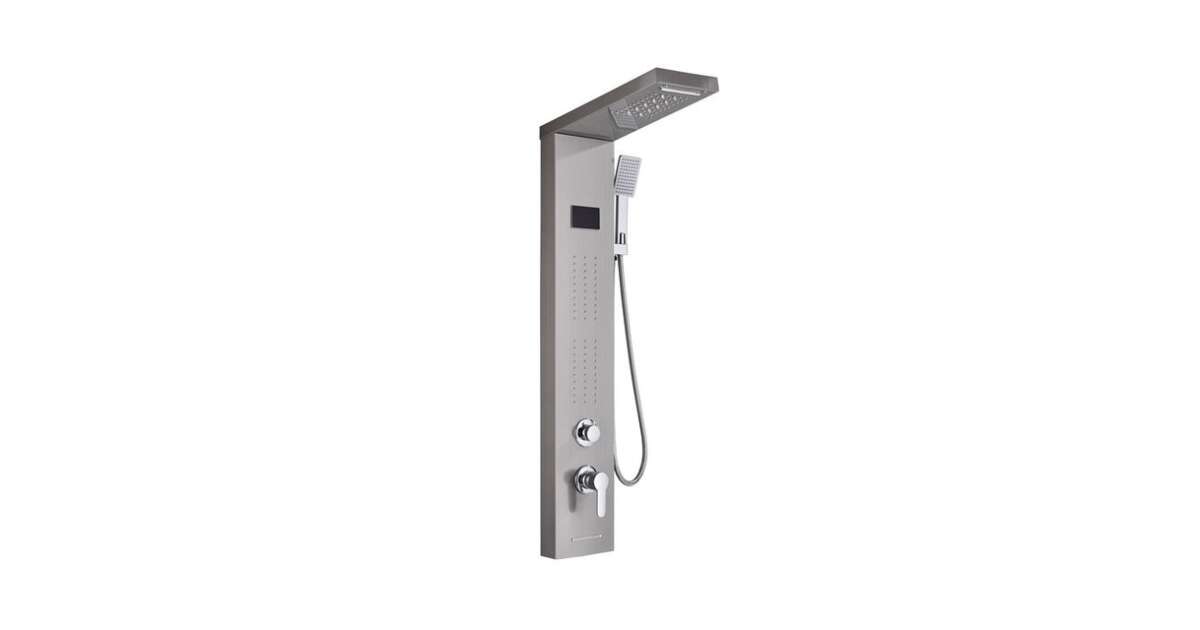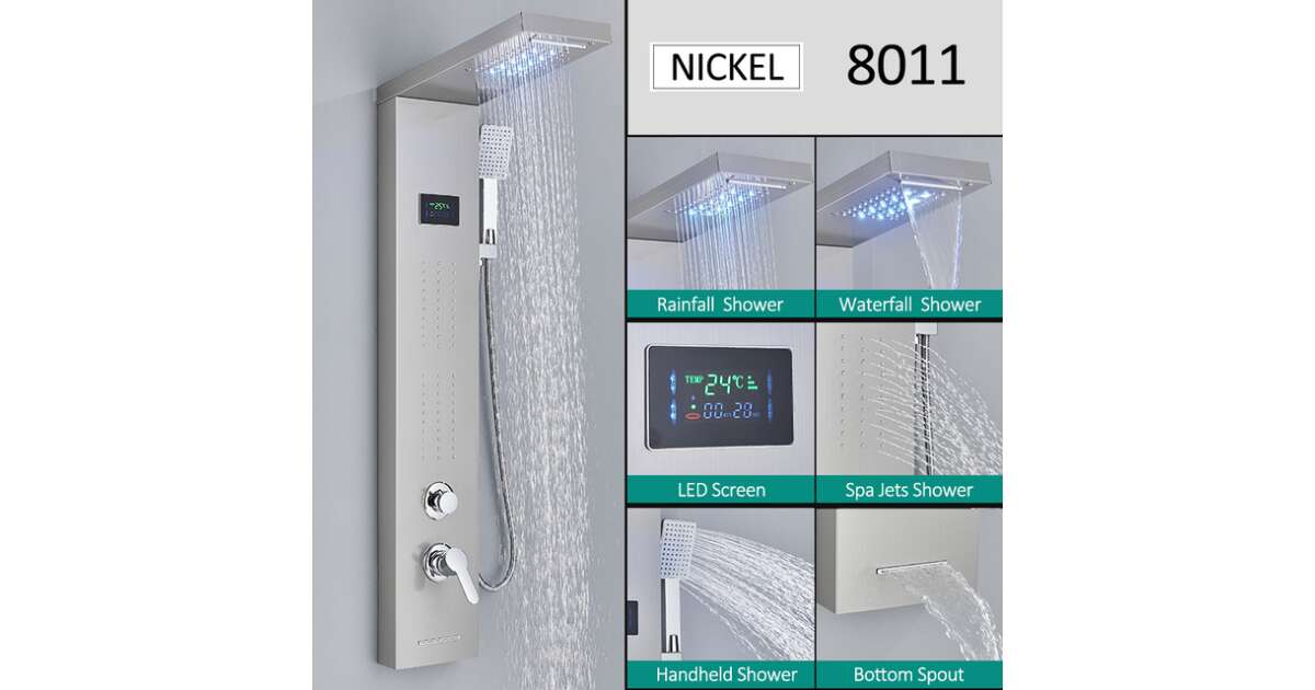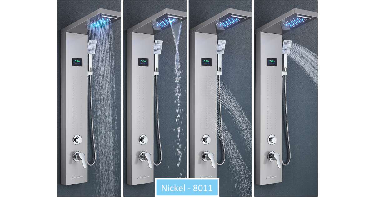 Blackswan Shower Panel, M8011 model, Nickel finish with waterfall tap, digital display, LED and SPA functions, 114 cm description of