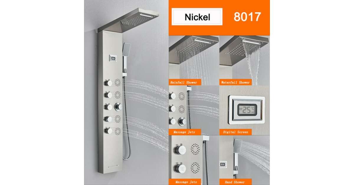 Blackswan Shower Panel, M8017 model in nickel with digital display, waterfall faucet and SPA functions, size 114 cm description of