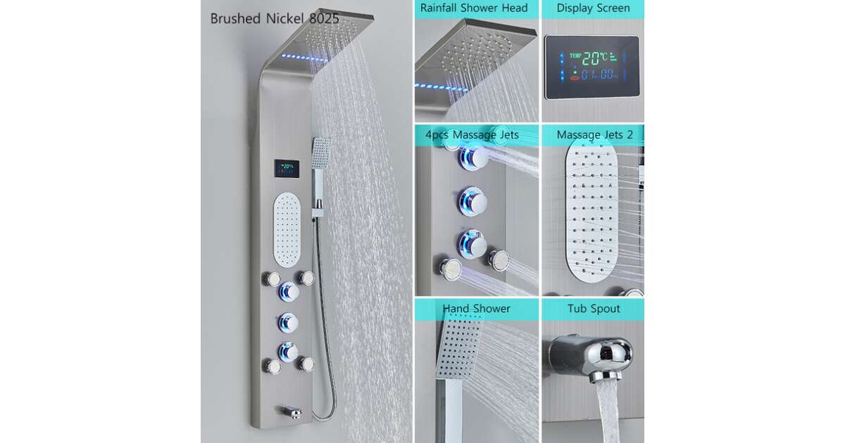 Blackswan Shower Panel, M8025 model in nickel with LED, digital display, faucet and SPA functions, size 117 cm description of