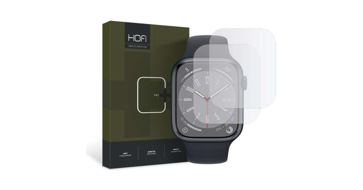 Two HOFI Hydroflex Pro screen protectors for Apple Watch 4/5/6/7/8/SE 44/45mm models. Protect your precious smartwatch from scratches and damage with this high-quality film!