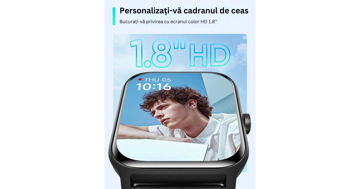 This stylish and functional smartwatch is perfect for an active and connected lifestyle. It boasts a large 1.8-inch HD screen for clear and intuitive information viewing.