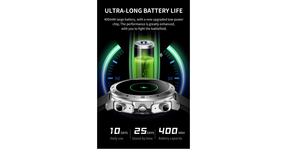 - 400 mAh battery: Long battery life (up to 25 days on standby).